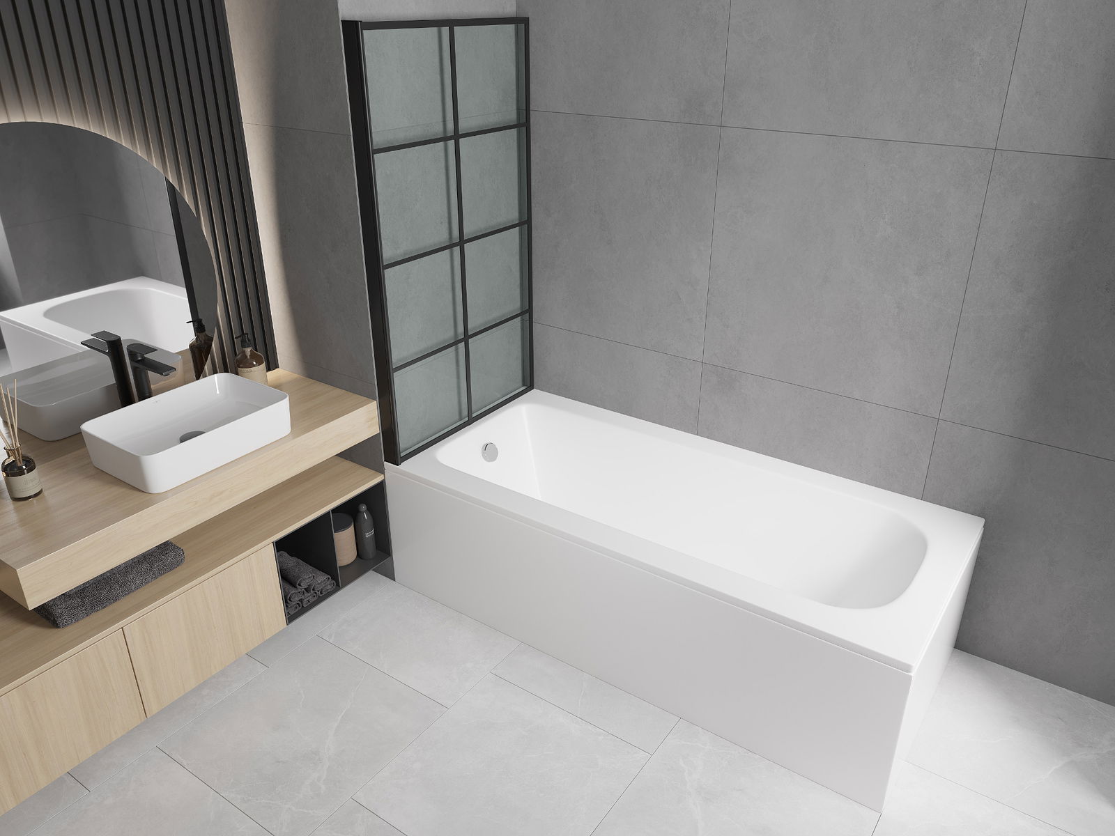 Paravanul are un singur canat mobil cu posibilitatea de a se plia. Această soluție permite economisirea mai multor spații în baie și permite utilizarea liberă a spațiului rămas atunci când nu folosim zona de baie.