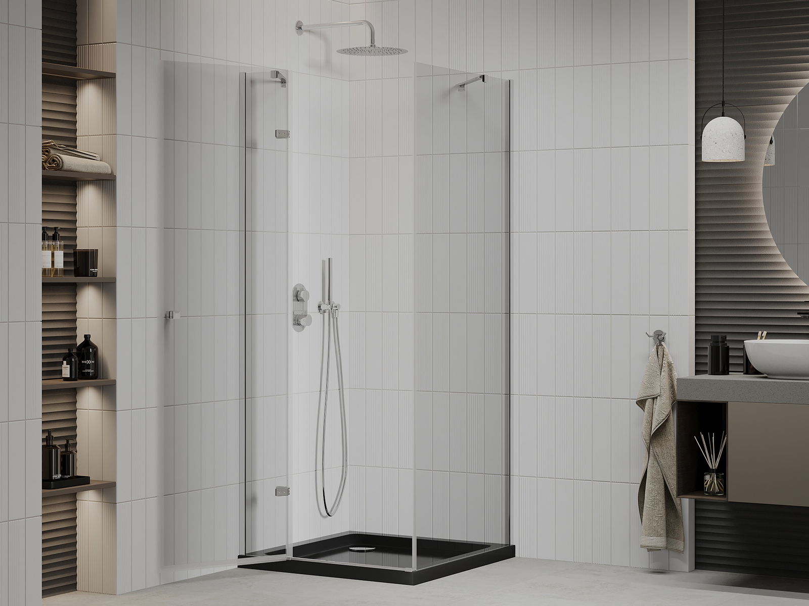 Mexen Roma cabină de duș cu ușă batantă 80 x 80 cm, transparentă, crom + cadă Flat, negru - 854-080-080-01-00-4070