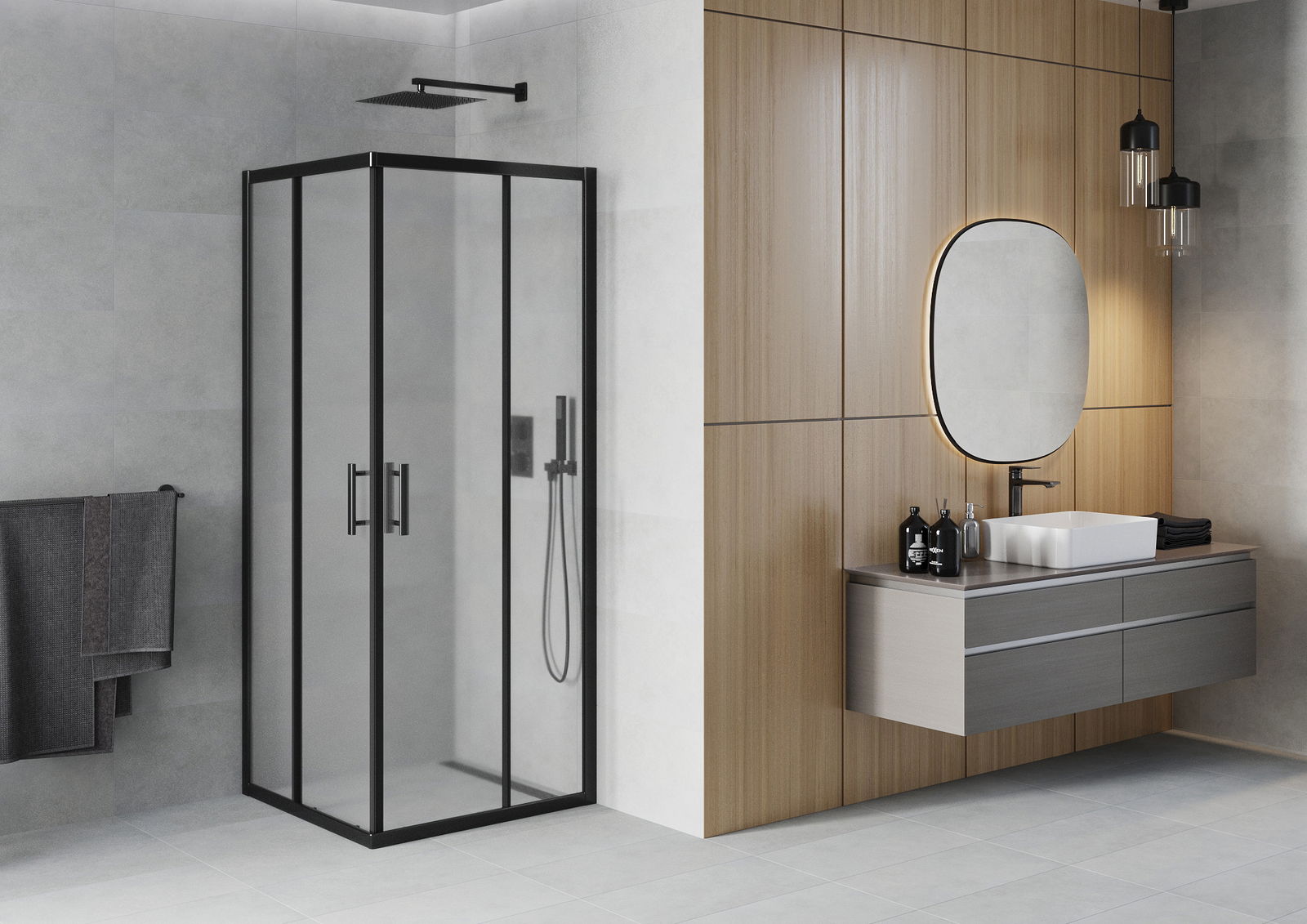 Mânerul practic și confortabil este realizat din metal durabil și rezistent. Forma modernă, combinată cu un finisaj asortat cu culoarea profilelor, conferă un aspect modern și elegant întregului, subliniind estetica fiecărei băi.