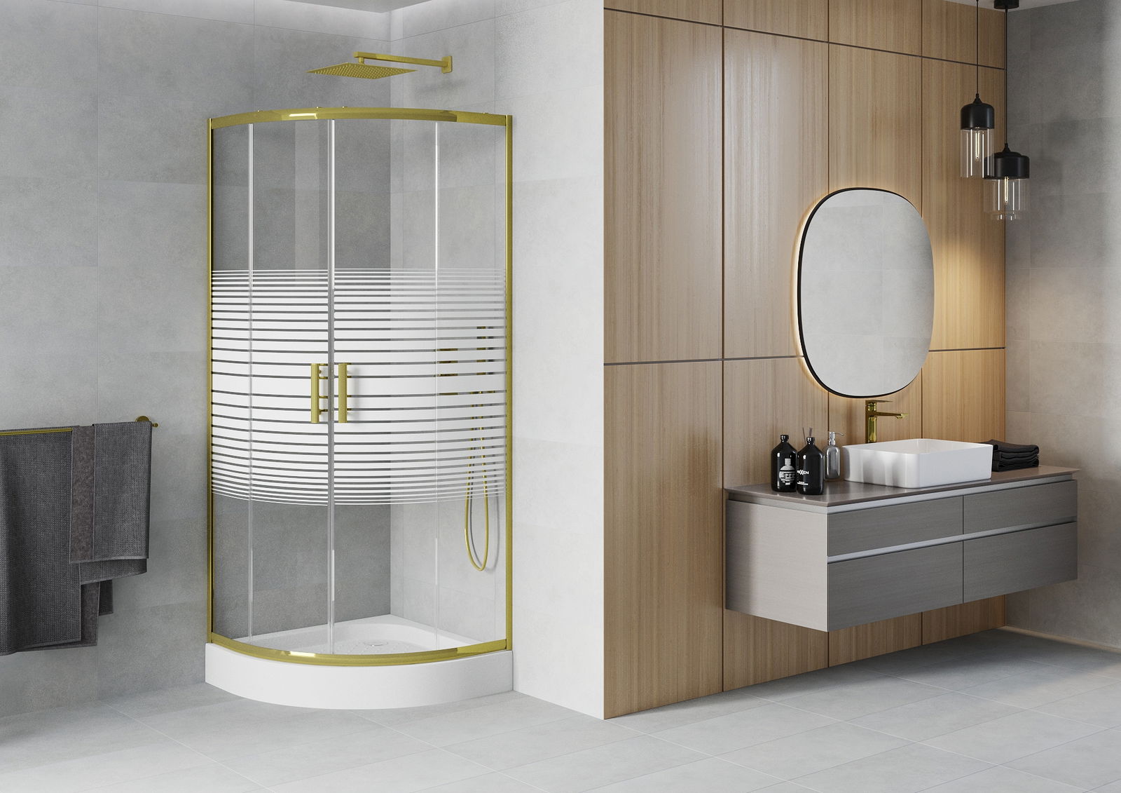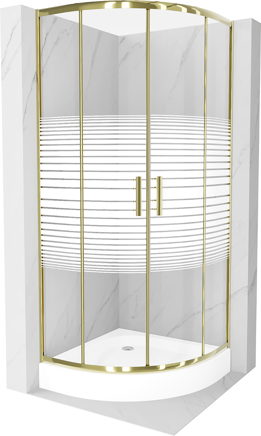 Mexen Rio cabină de duș semicirculară 90 x 90 cm, dungi albe, auriu + cadă Rio, alb - 863-090-090-50-20-4710