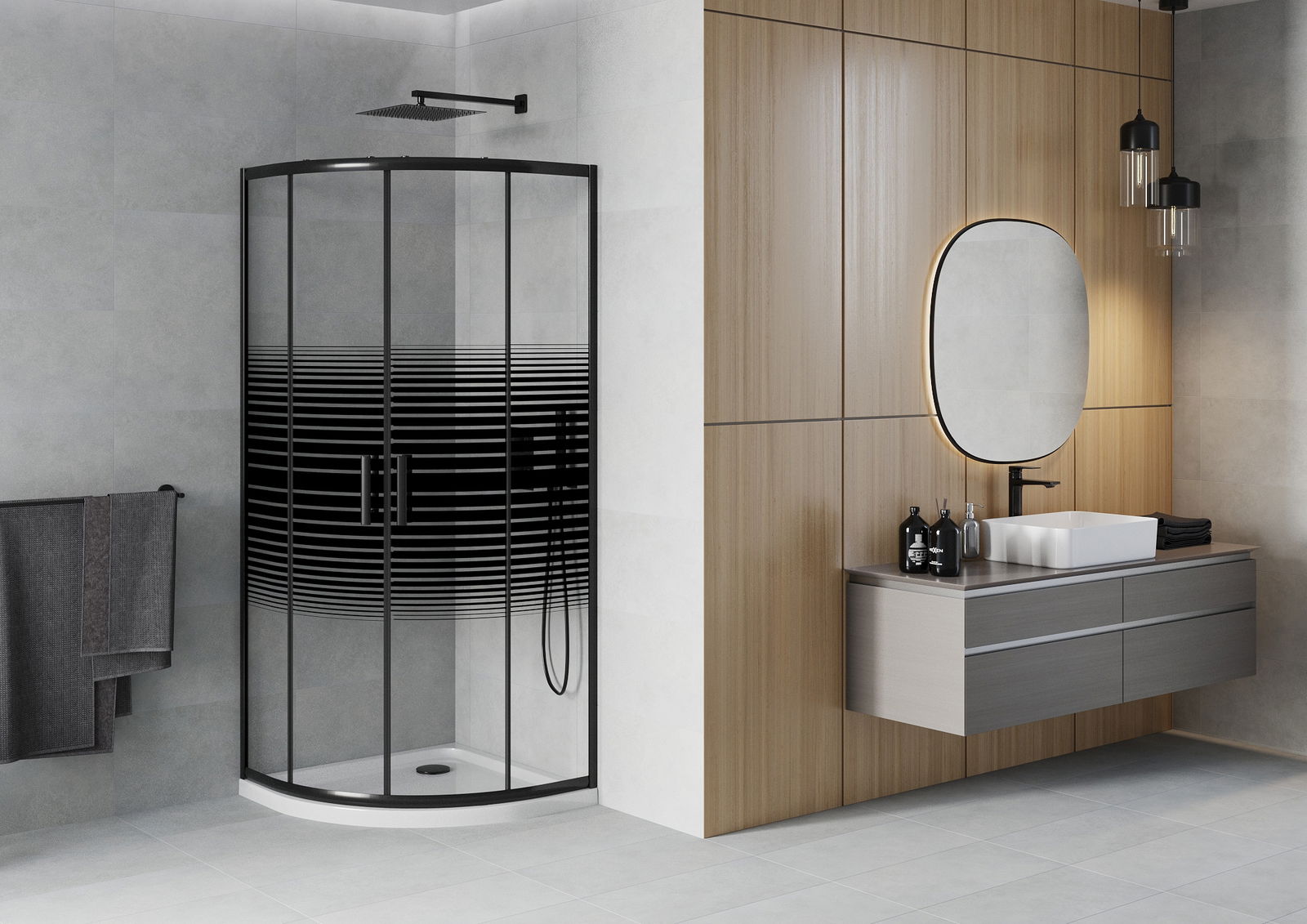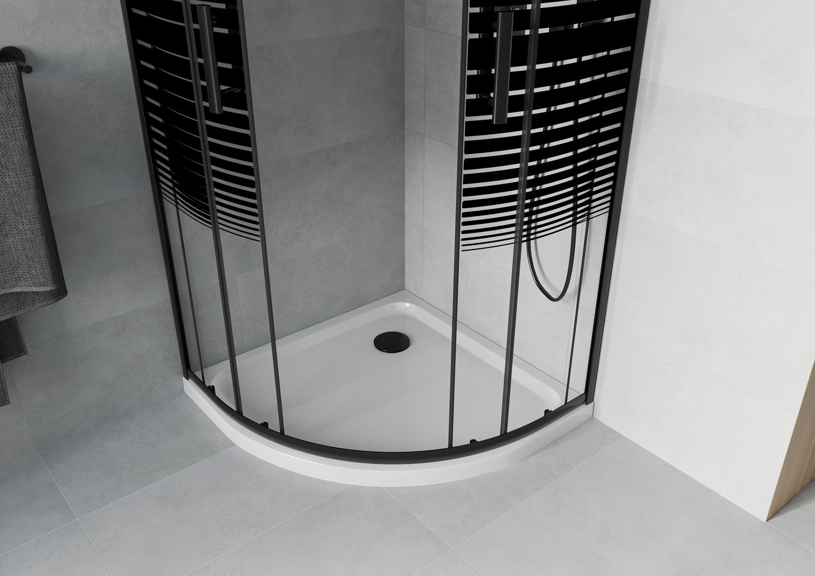 Mexen Rio cabina de duș semicirculară 90 x 90 cm, benzi negre, negru + cadă Flat, alb - 863-090-090-70-20-4110B