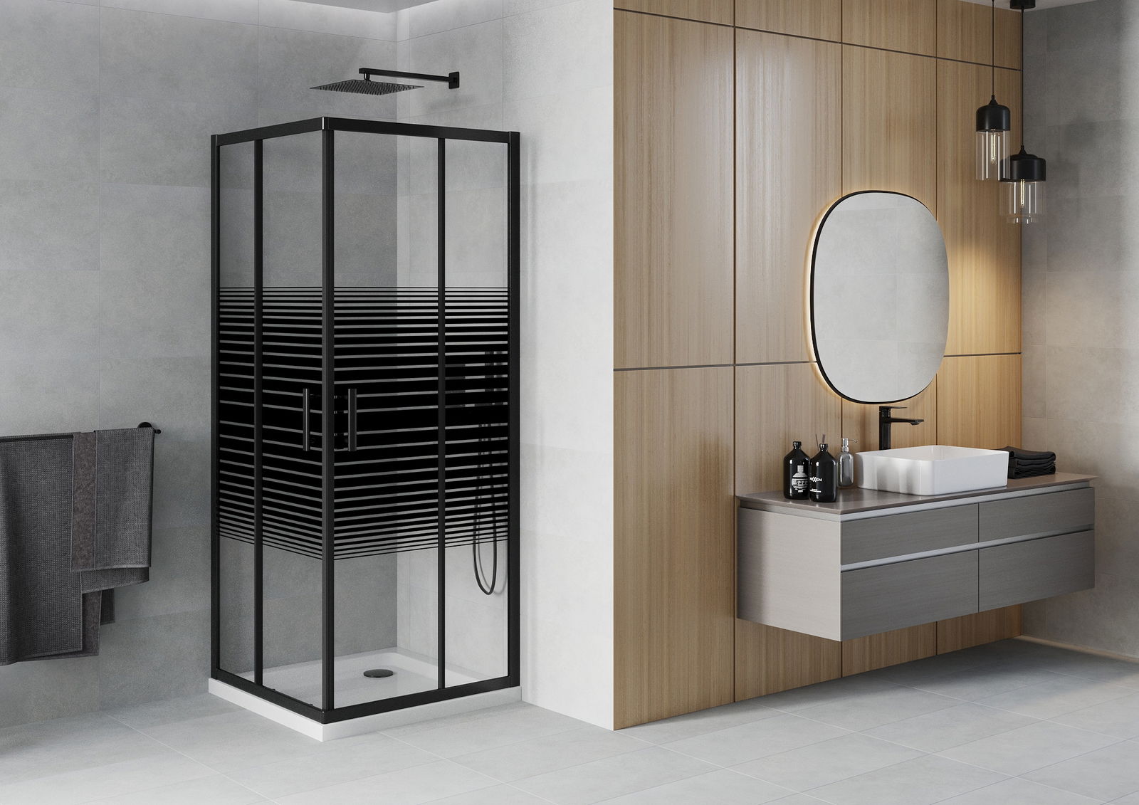 Mânerul la îndemână și confortabil era din metal durabil și rezistent. Forma la modă combinată cu un finisaj adaptat culorii profilurilor oferă întregului aspect modern și elegant, subliniind estetica fiecărei băi.