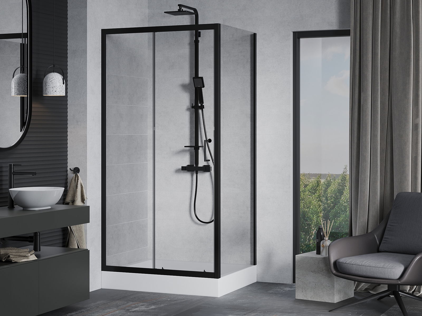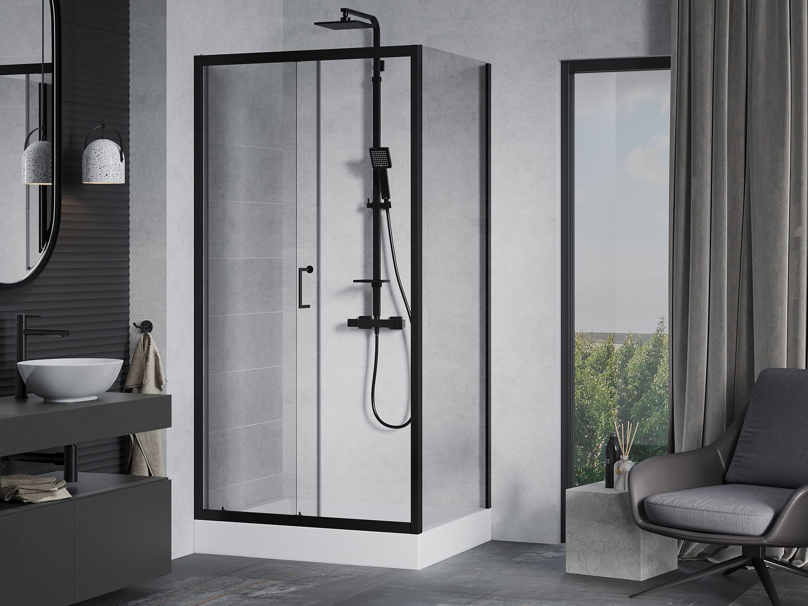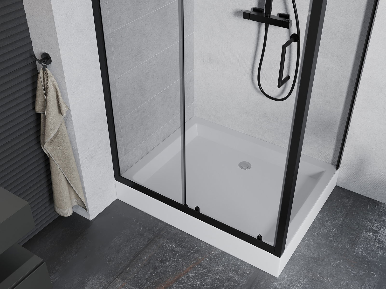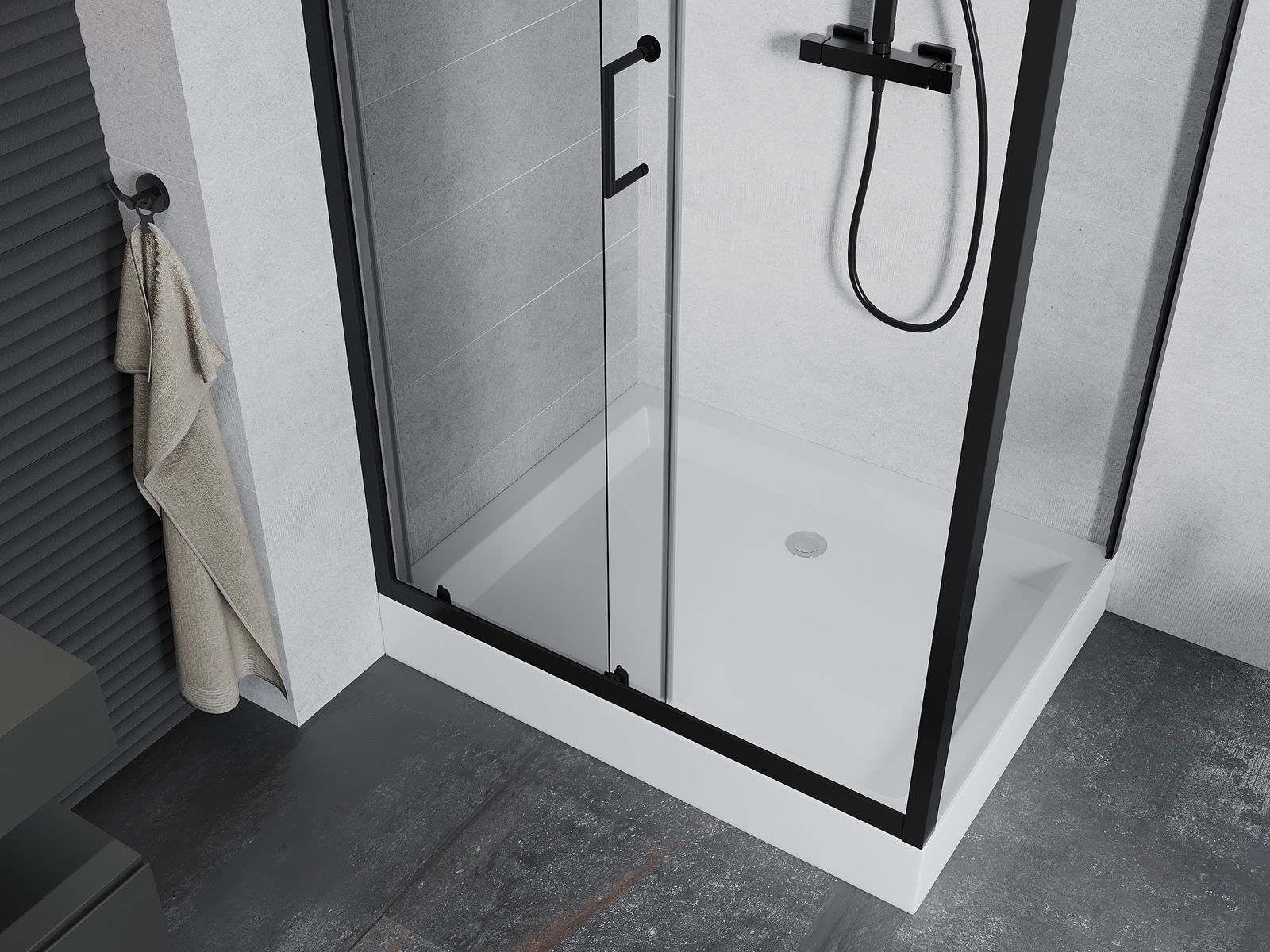 Mânerul practic și confortabil este realizat din metal durabil și rezistent. Forma modernă, combinată cu un finisaj asortat cu culoarea profilelor, conferă un aspect modern și elegant întregului, subliniind estetica fiecărei băi.