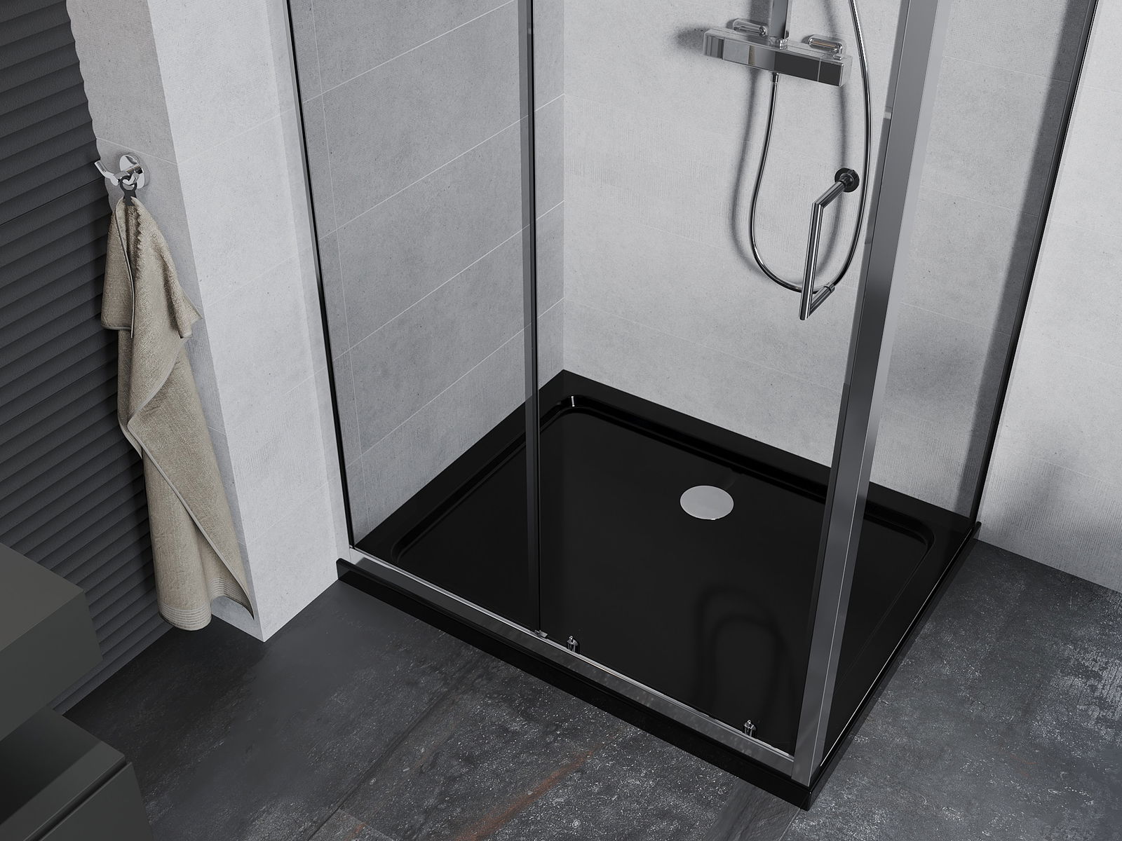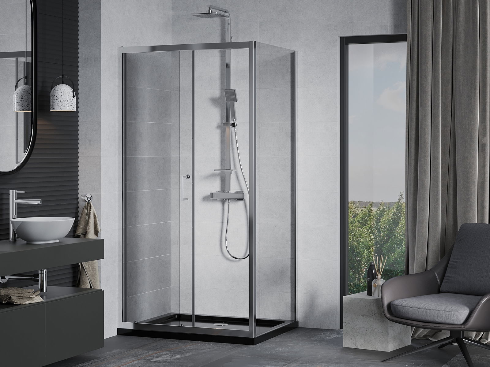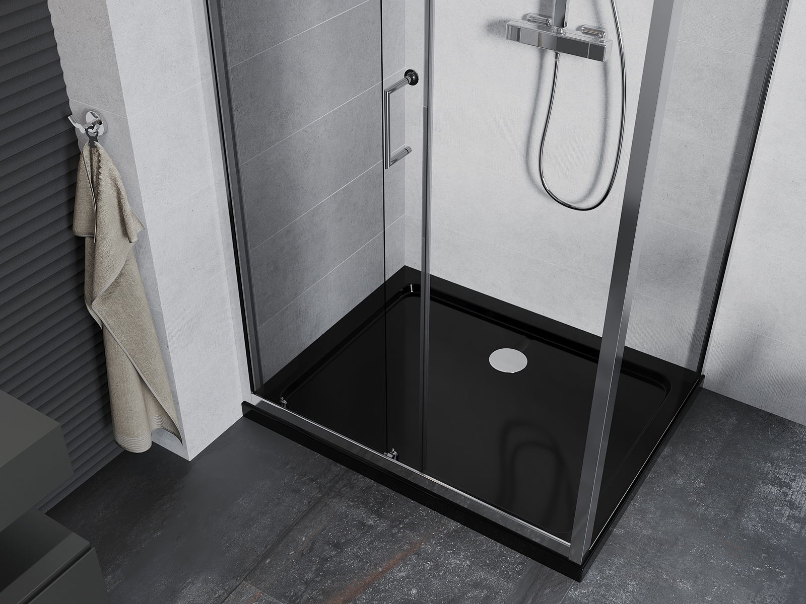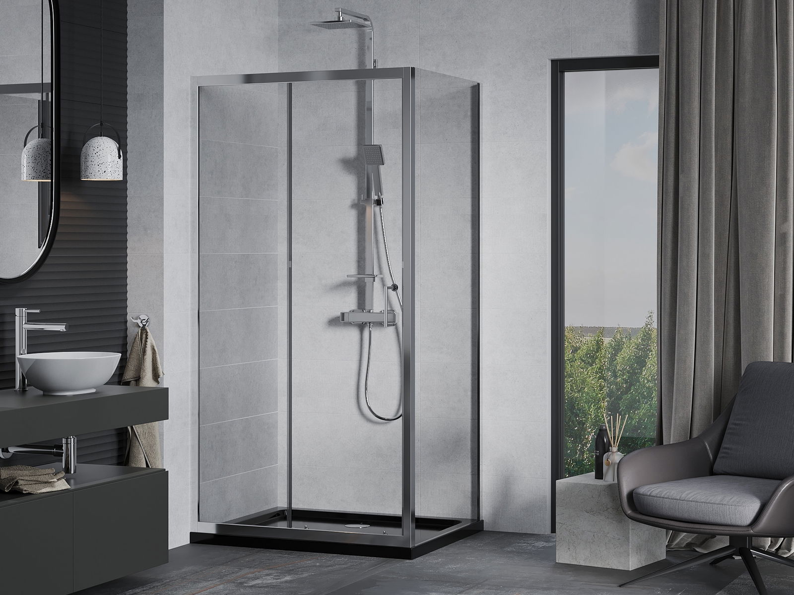 Mânerul practic și confortabil este realizat din metal durabil și rezistent. Forma modernă, combinată cu un finisaj asortat cu culoarea profilelor, conferă un aspect modern și elegant întregului, subliniind estetica fiecărei băi.