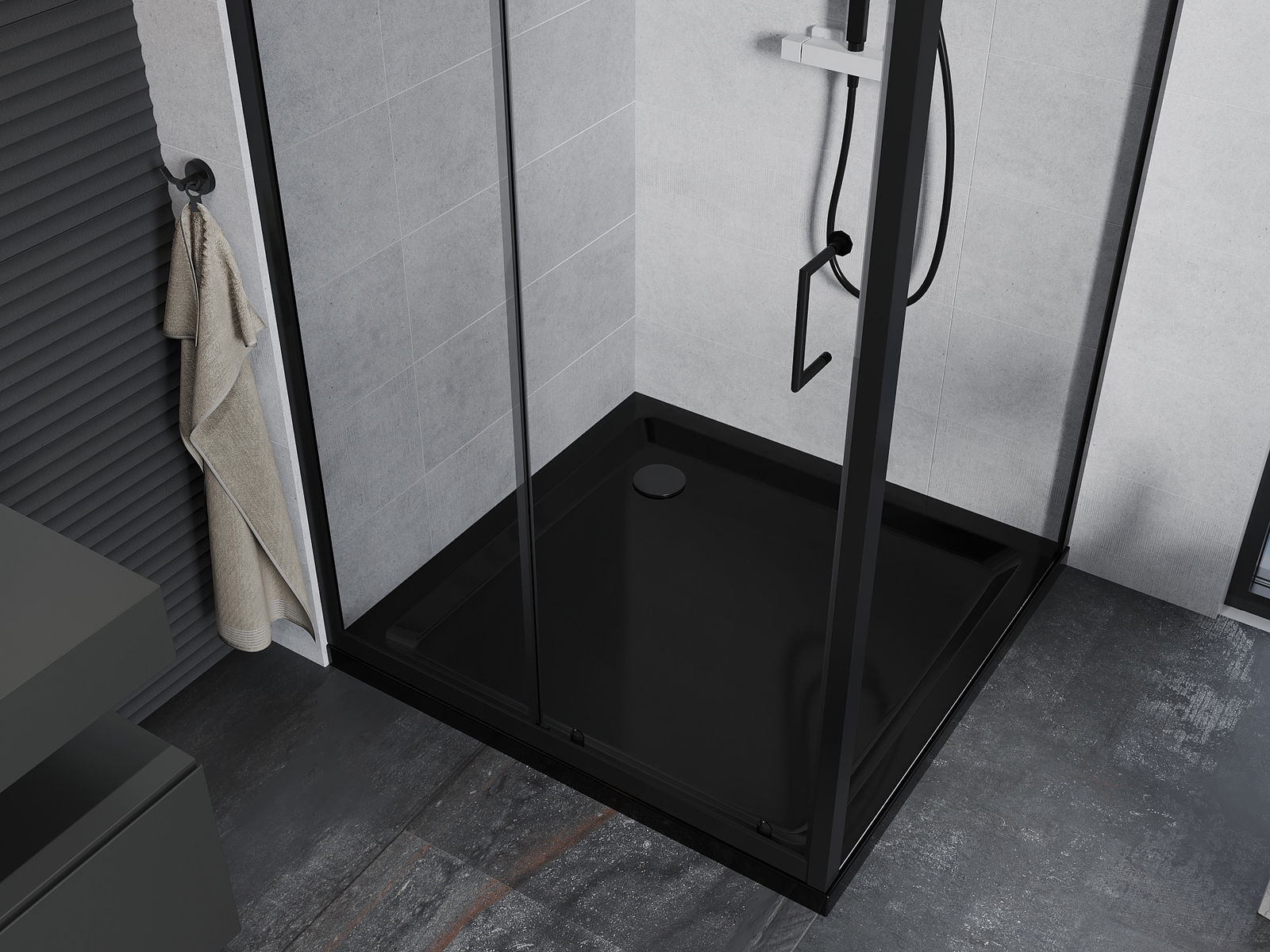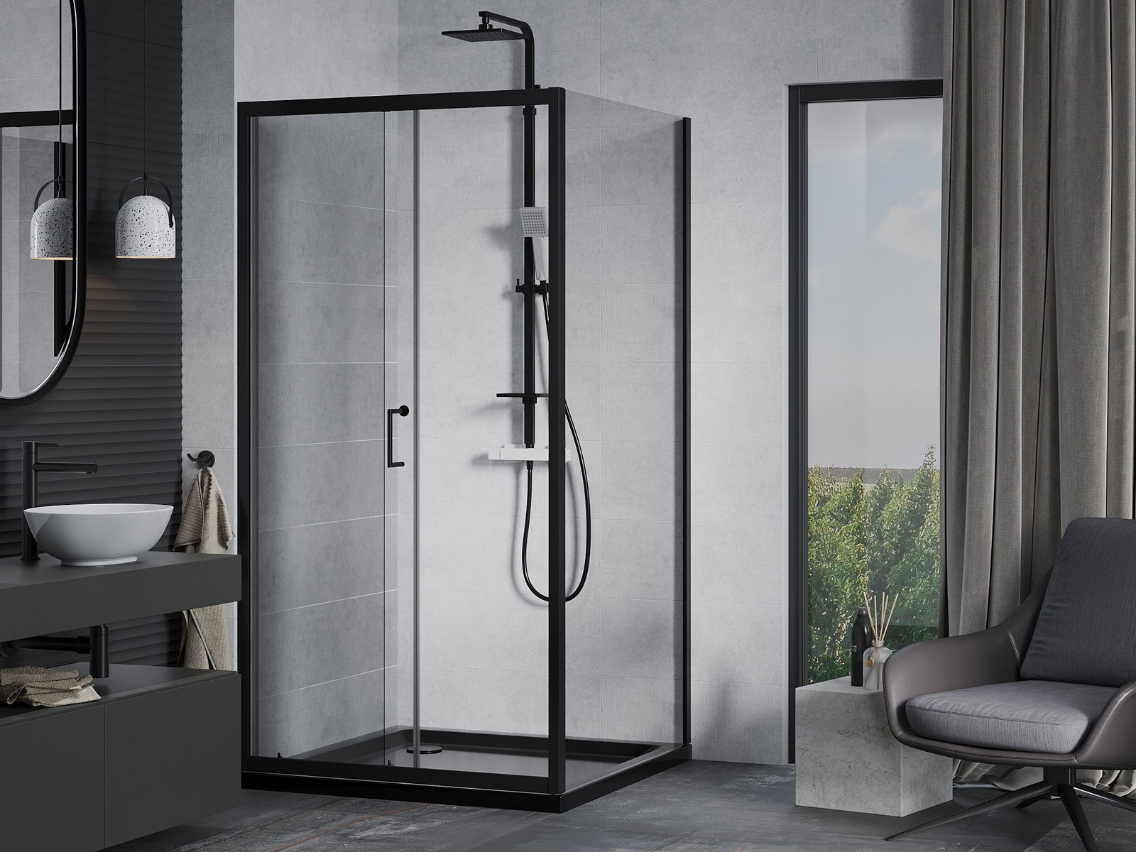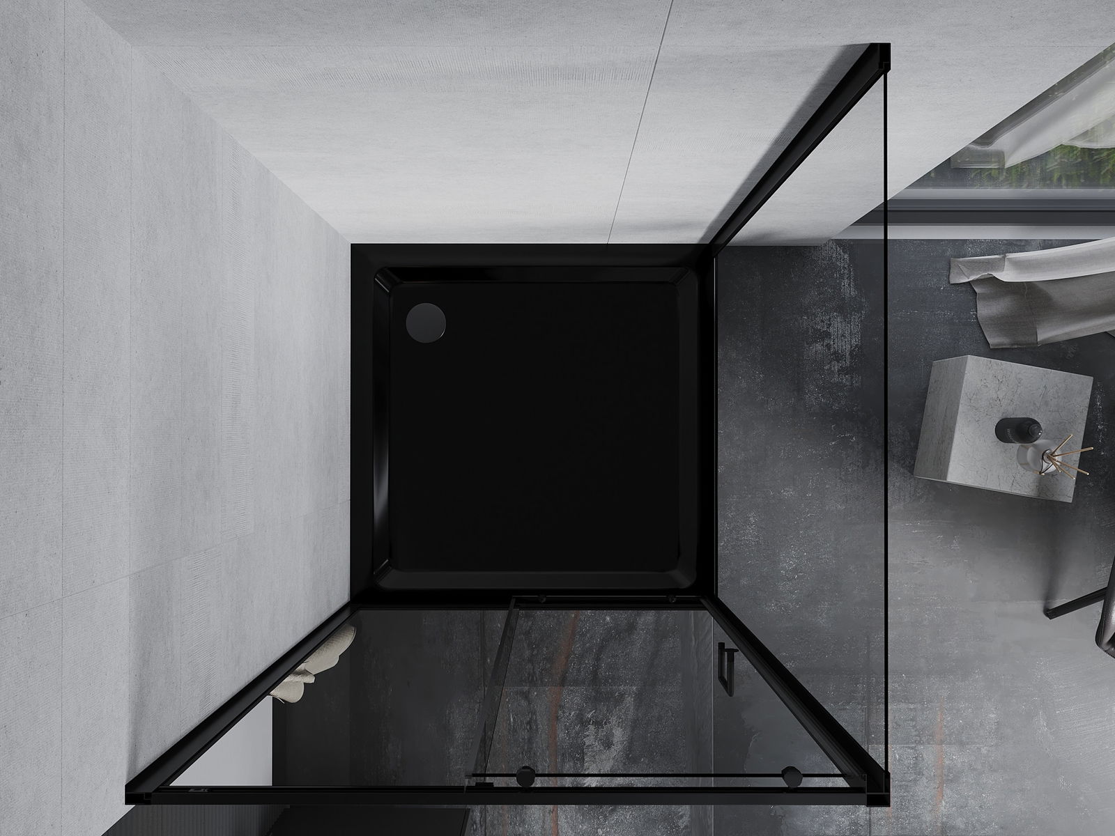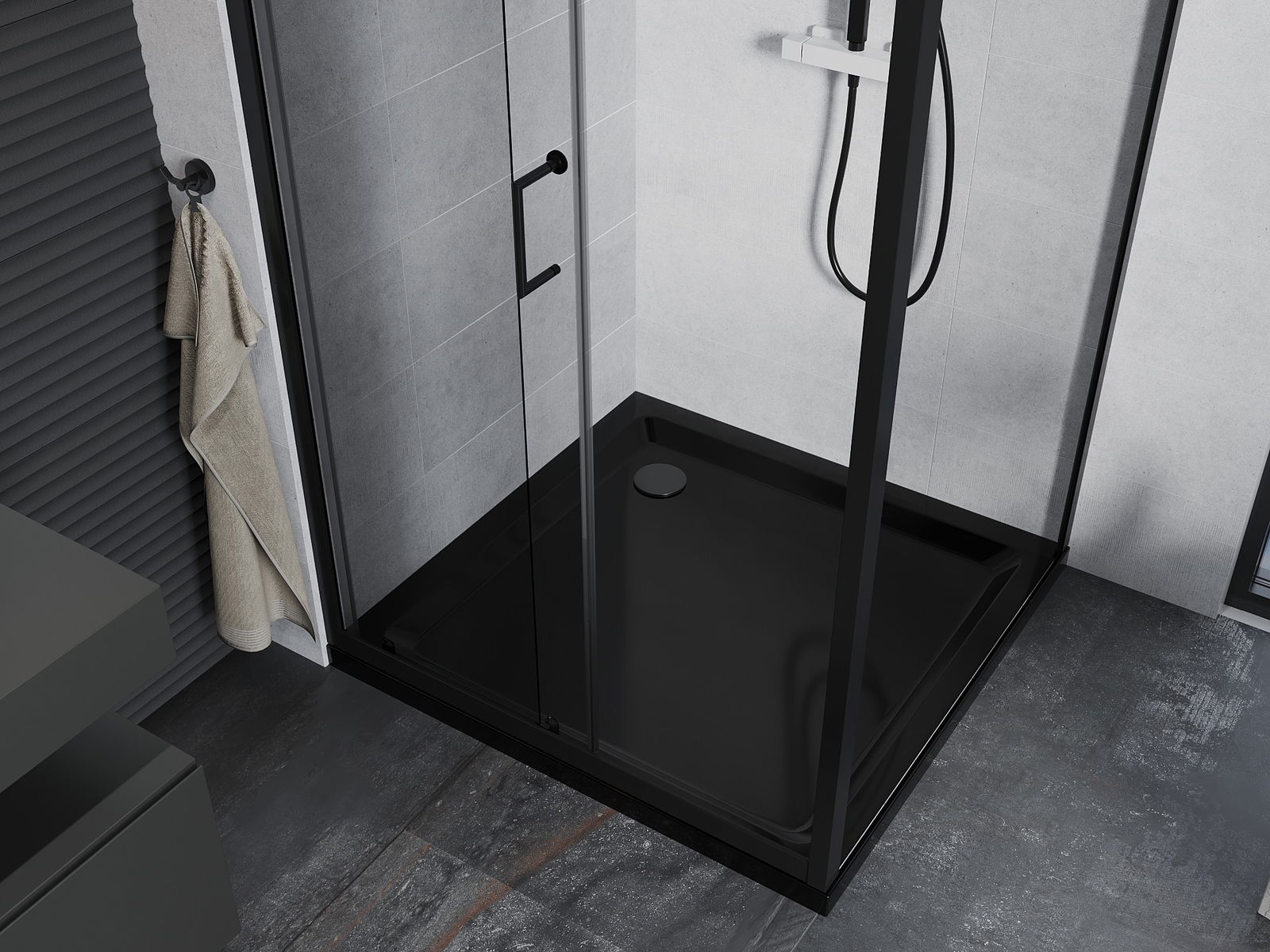 Cabină de duș culisantă Mexen Apia 90 x 90 cm, transparentă, neagră + cadă Flat, neagră - 840-090-090-70-00-4070B