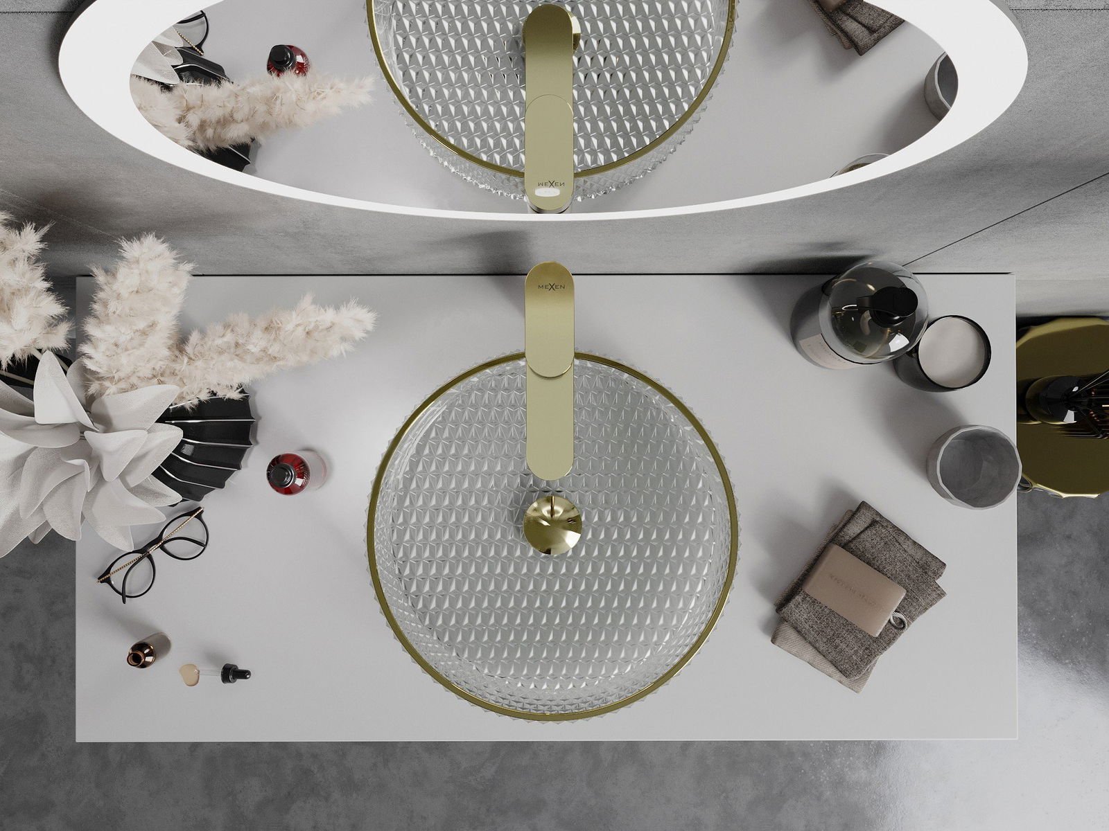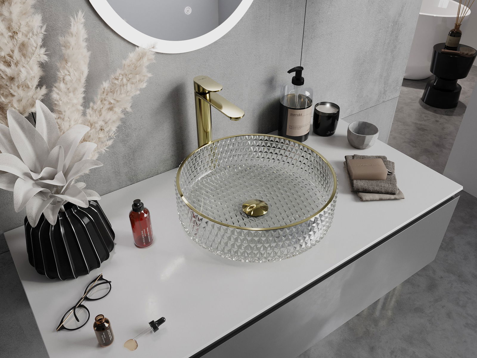 Lavoarul pe blat Mexen Aura 39 x 39 cm îmbină eleganța cu funcționalitatea. Realizat din sticlă, în culoare transparentă și aurie, se potrivește perfect în interioarele moderne. Forma sa rotundă și înălțimea de 11,5 cm asigură confort în utilizare, iar lipsa orificiilor pentru baterie și preaplin oferă libertate în alegerea armăturii. Ideal pentru băi elegante, acest lavoar nu este doar estetic, ci și ușor de întreținut, ceea ce îl face o alegere practică pentru orice casă.