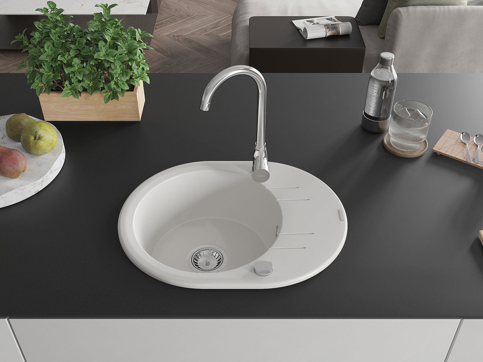 Mexen Kevin chiuvetă granitică cu 1 compartiment cu scurgător 586 x 458 mm, alb, sifon crom - 6517581005-20