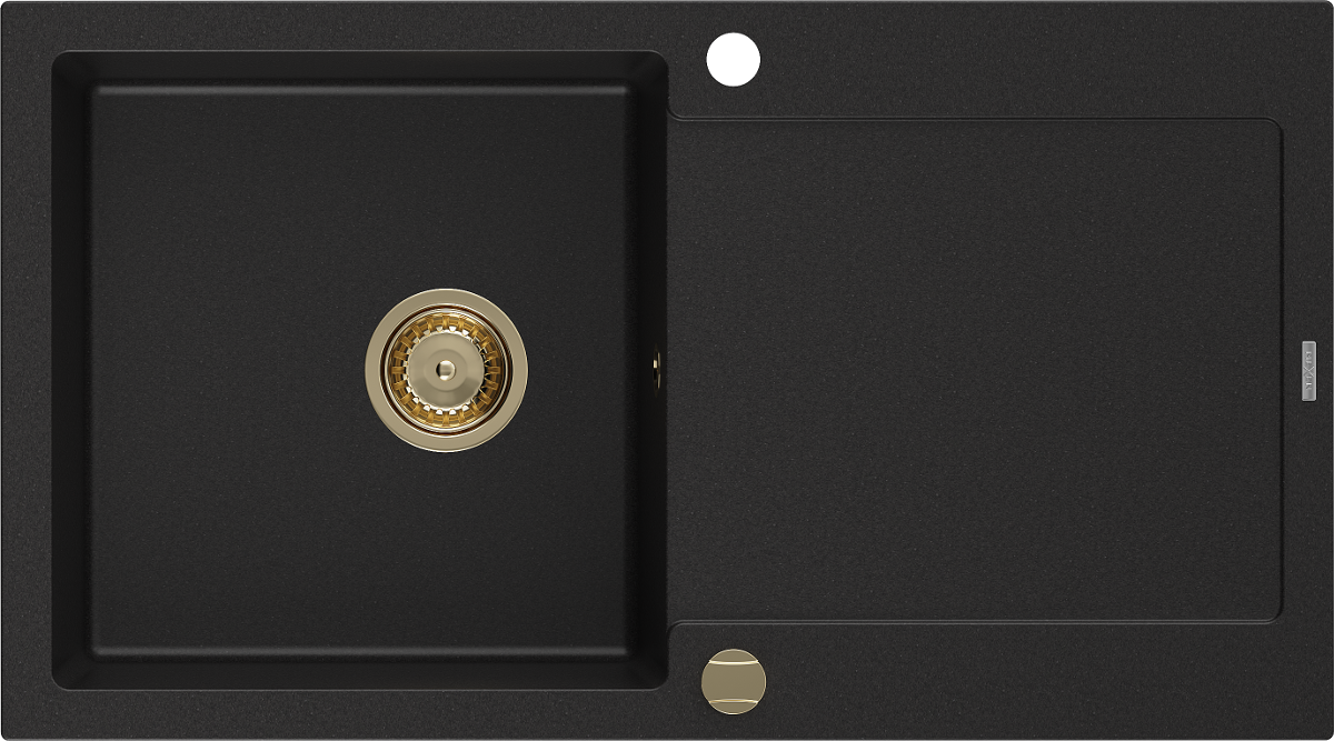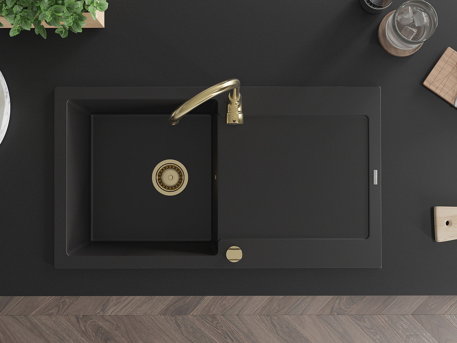 Mexen Leo chiuvetă din granit cu 1 cuvă cu scurgător 900 x 500 mm, negru, sifon auriu - 6501901010-77-G