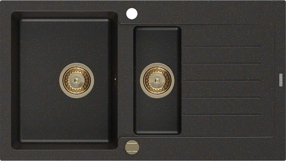 Mexen Matias chiuvetă de granit cu 1,5 compartimente și scurgător 900 x 505 mm, negru/auriu metalizat, sifon auriu - 6502901505?