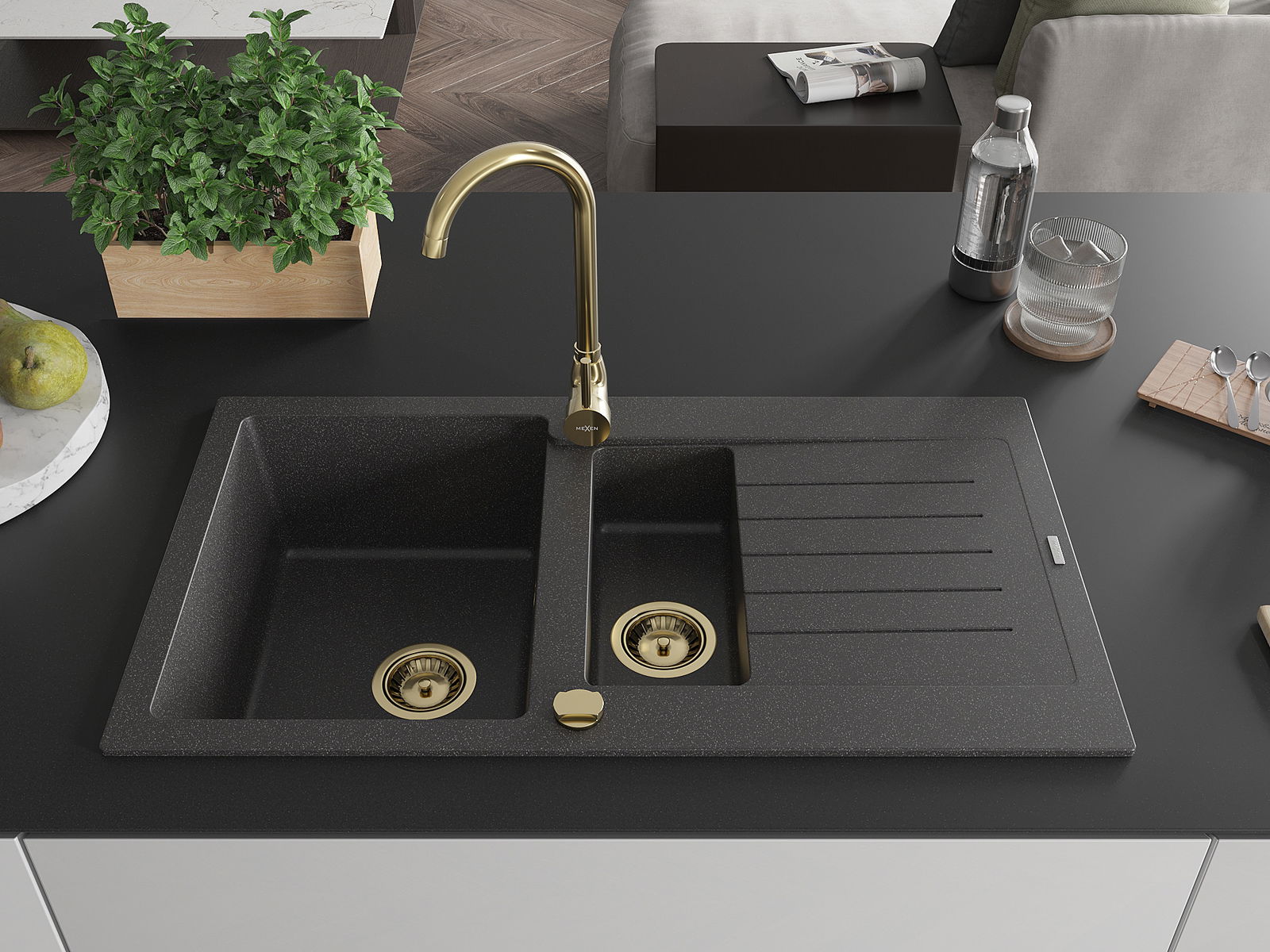 Mexen Matias chiuvetă din granit cu 1,5 cuve și picurător 900 x 505 mm, negru cu pete, sifon auriu - 6502901505-76-G