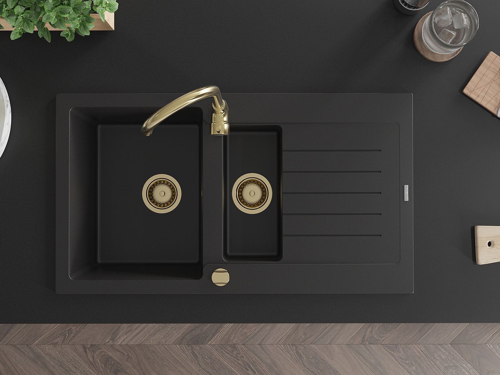 Mexen Matias chiuvetă din granit 1,5 cuve cu picurător 900 x 505 mm, negru, sifon auriu - 6502901505-77-G