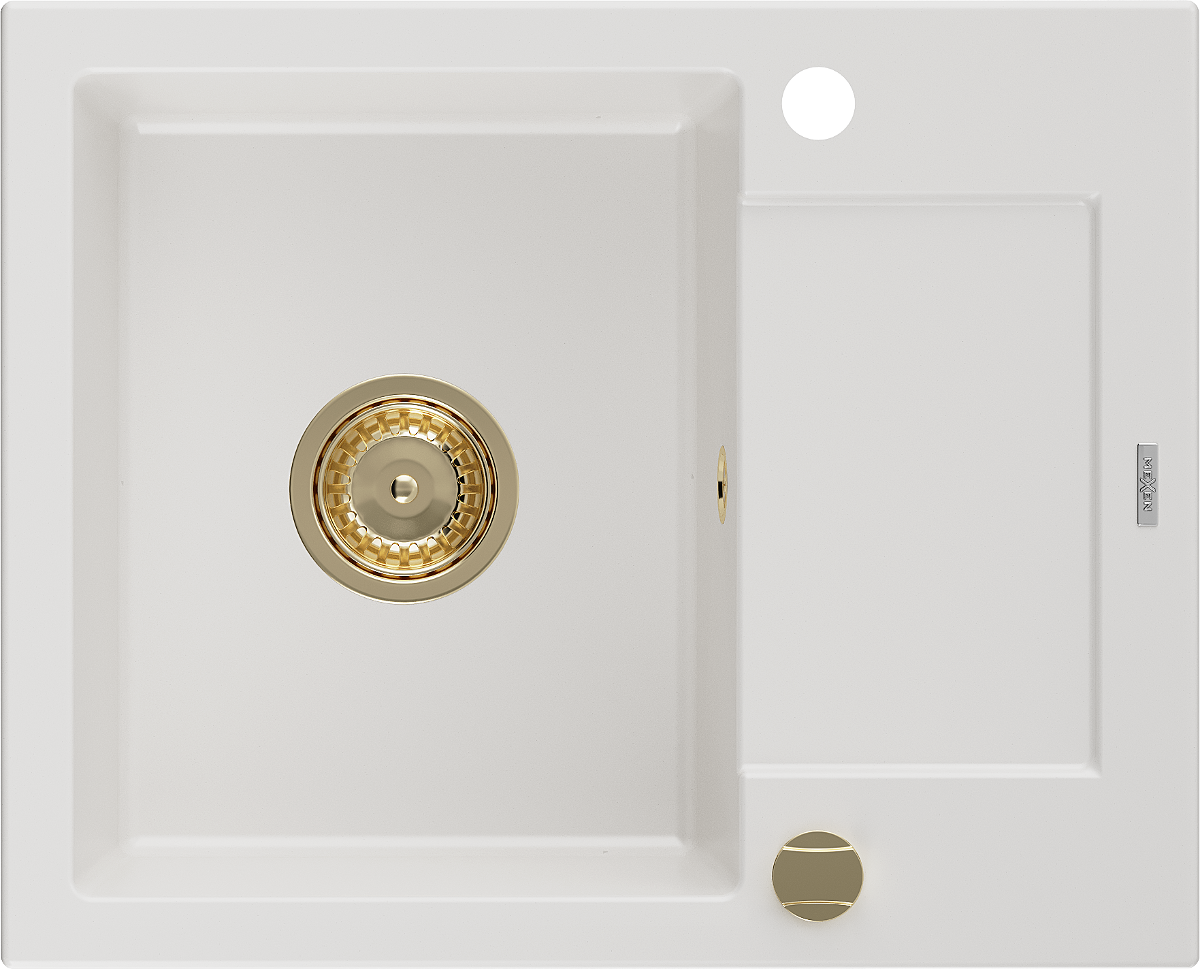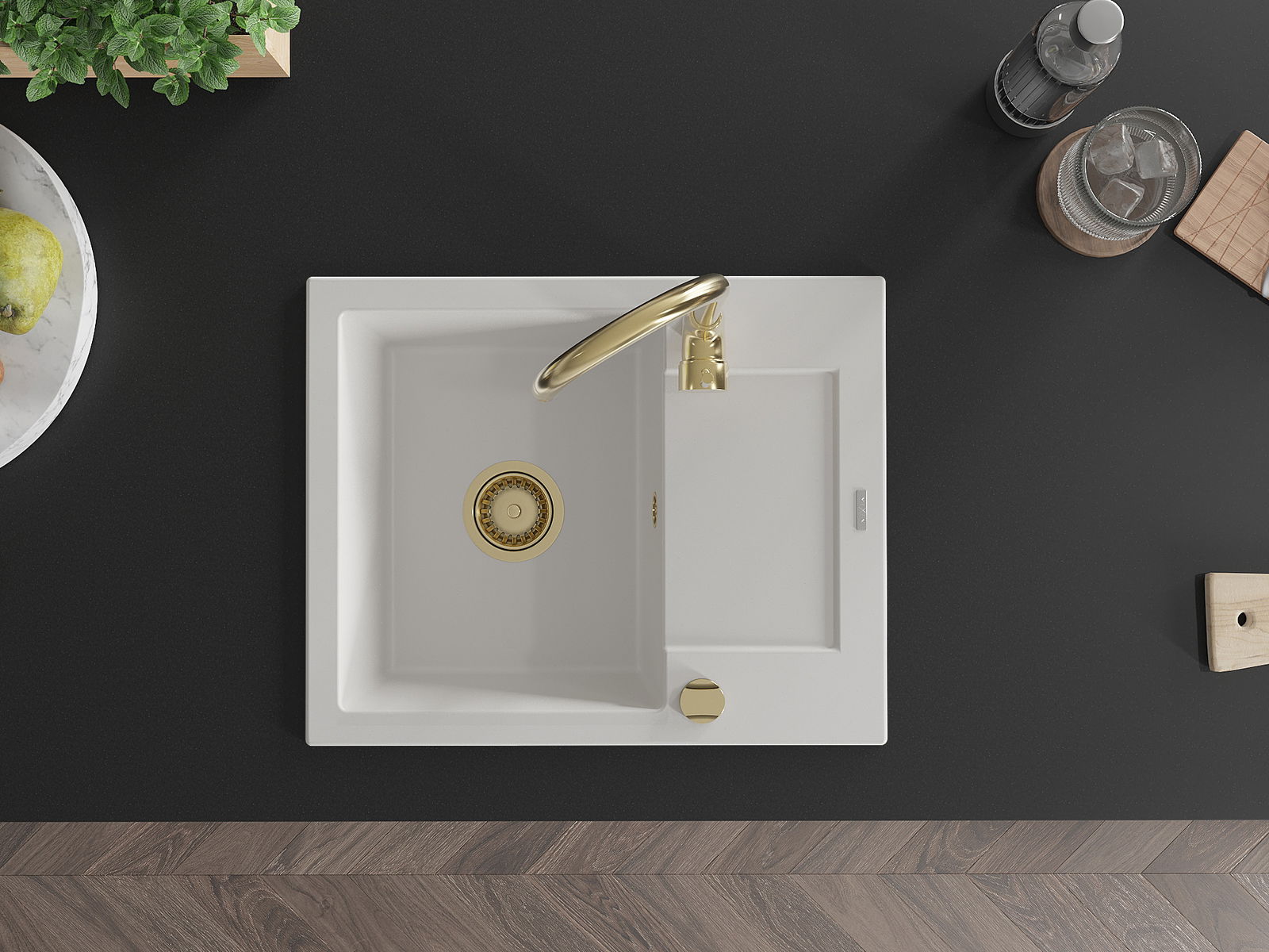 Mexen Enzo chiuvetă granit cu 1 compartiment cu picurător 576 x 465 mm, alb, sifon auriu - 6506571005-20-G
