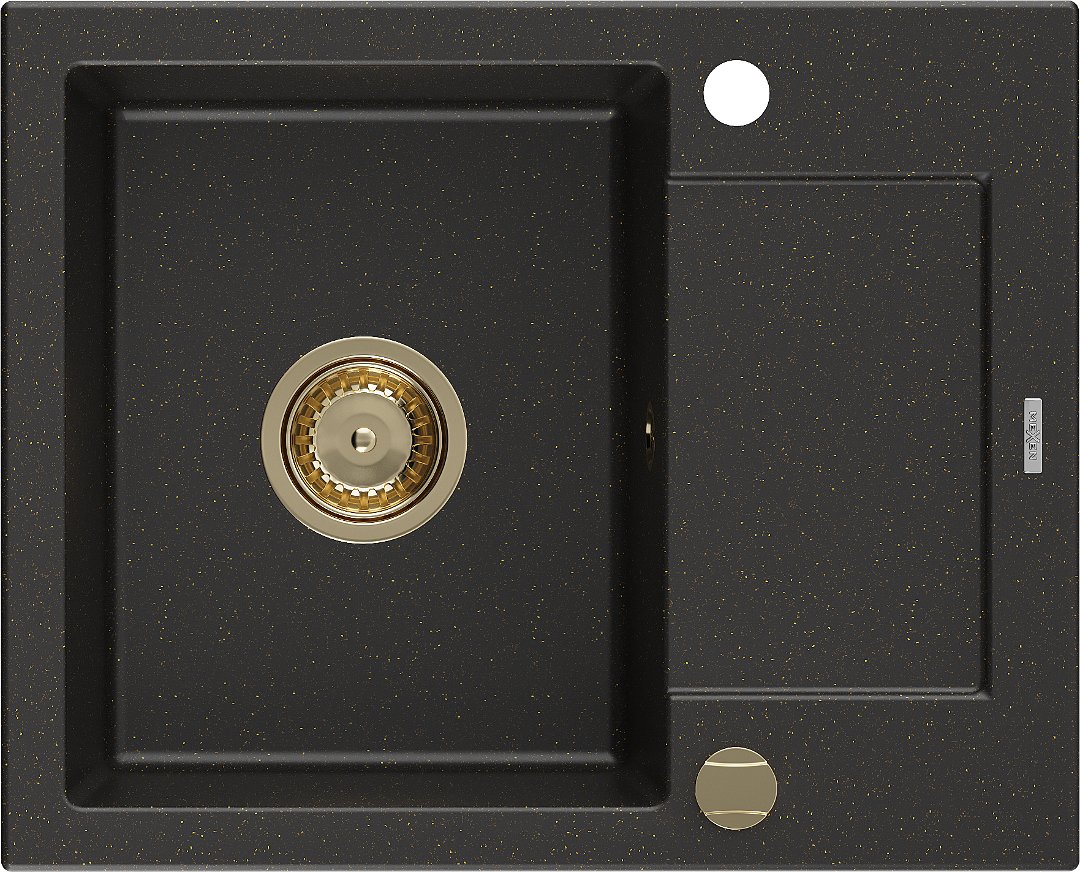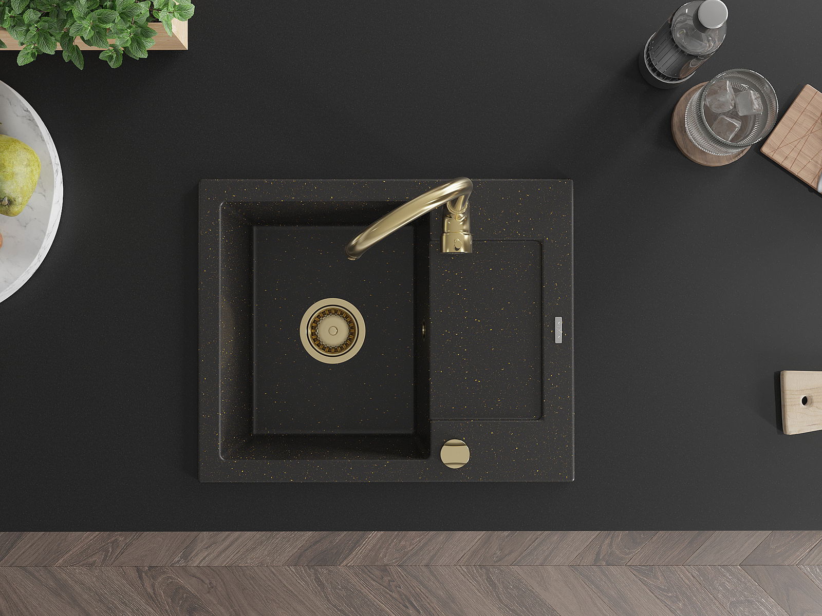 Mexen Enzo chiuvetă de granit cu 1 compartiment și picurător 576 x 465 mm, negru/auriu metalizat, sifon auriu - 6506571005-75-G