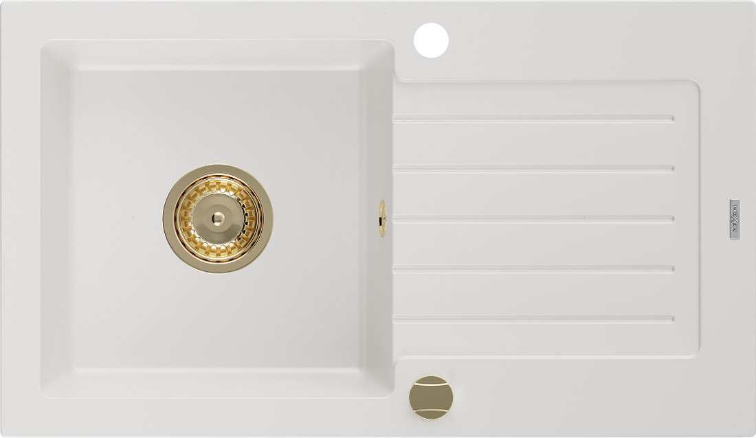 Mexen Pablo chiuvetă de bucătărie din granit cu 1 compartiment și picurător 752 x 436 mm, alb, sifon auriu - 6510751010-20-G