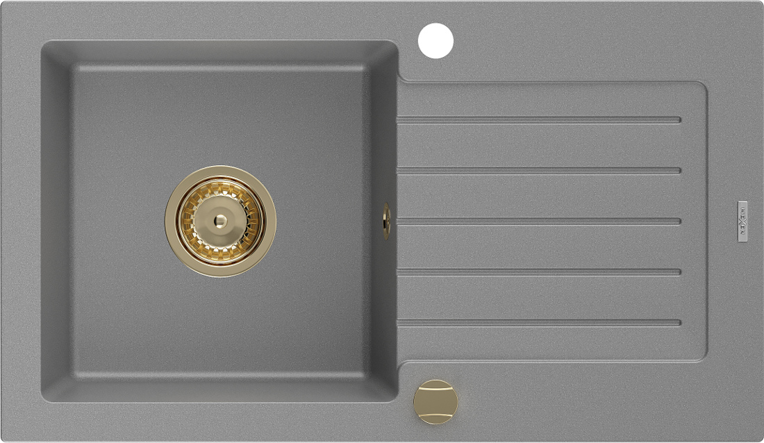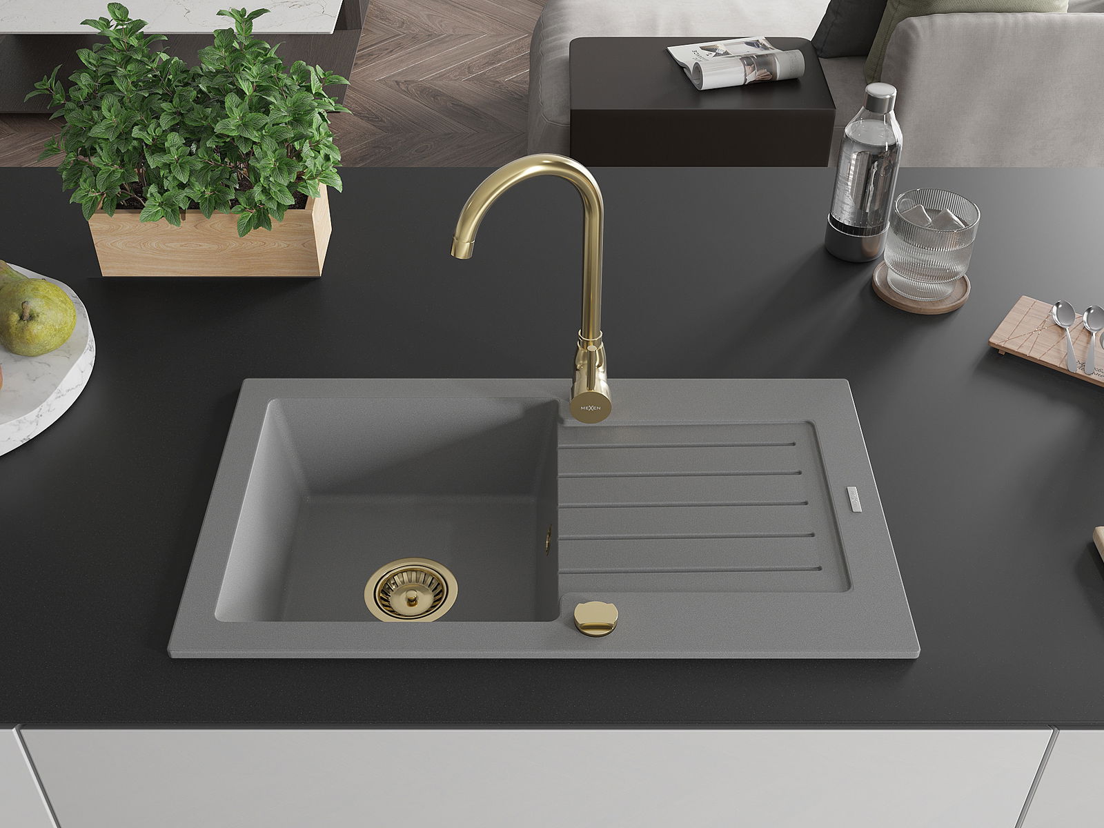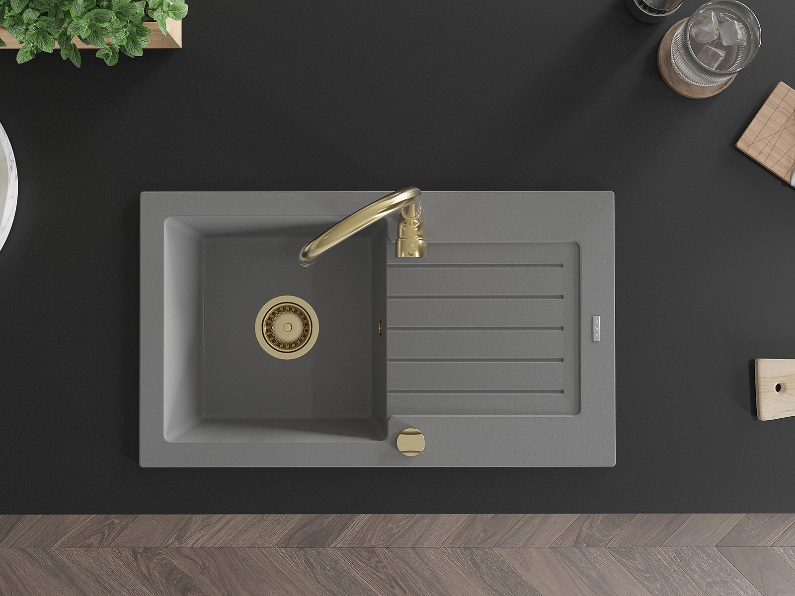 Mexen Pablo chiuvetă de granit cu 1 compartiment și scurgător 752 x 436 mm, gri, sifon auriu - 6510751010-71-G