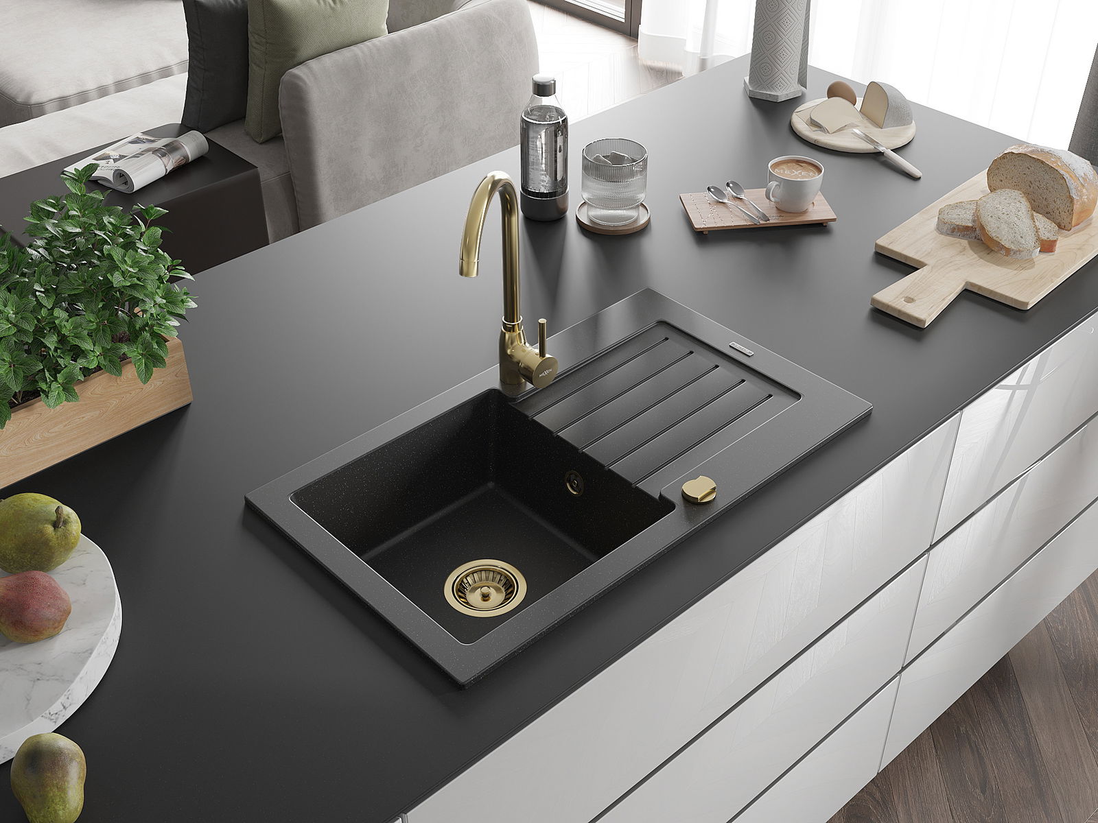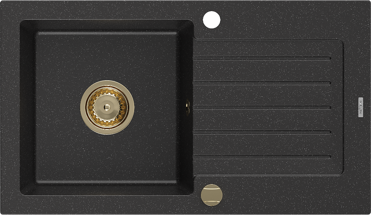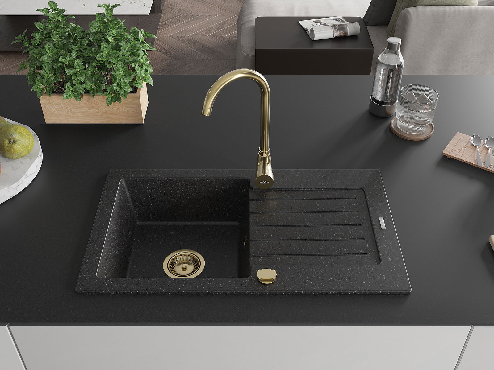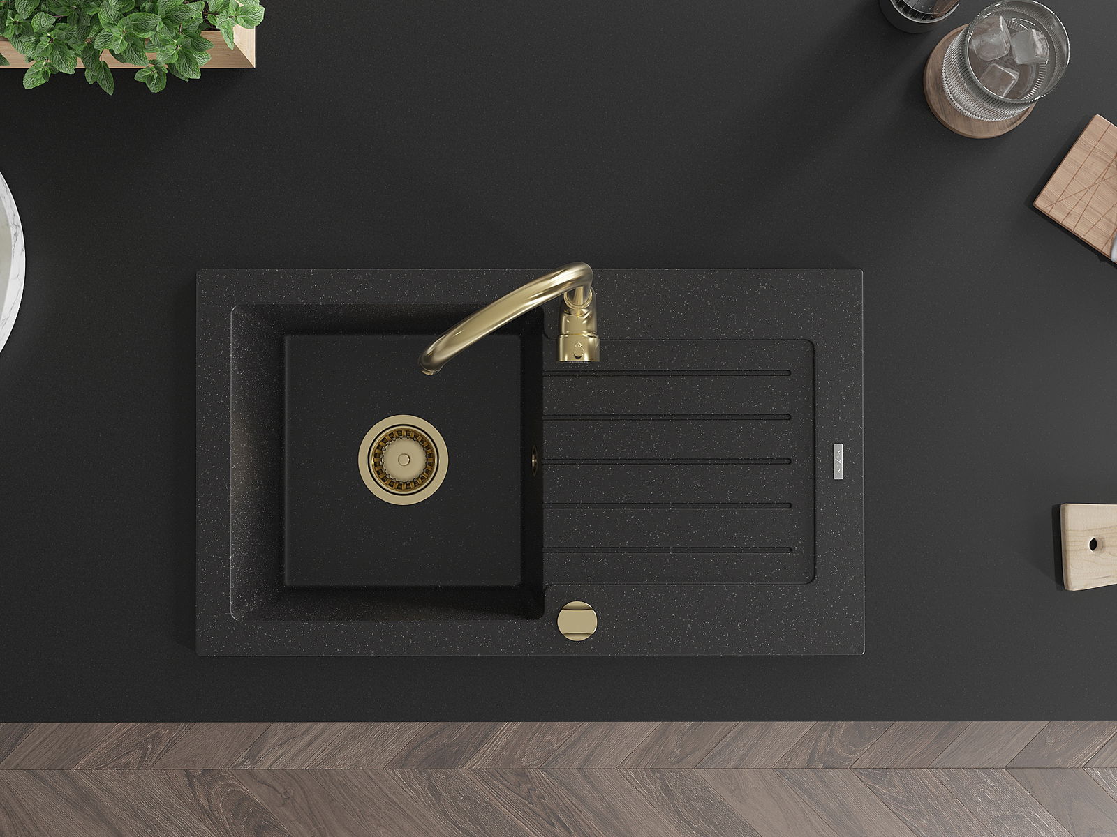 Mexen Pablo chiuvetă de granit cu 1 cuvă și picurător 752 x 436 mm, negru/argintiu metalic, sifon auriu - 6510751010-73-G