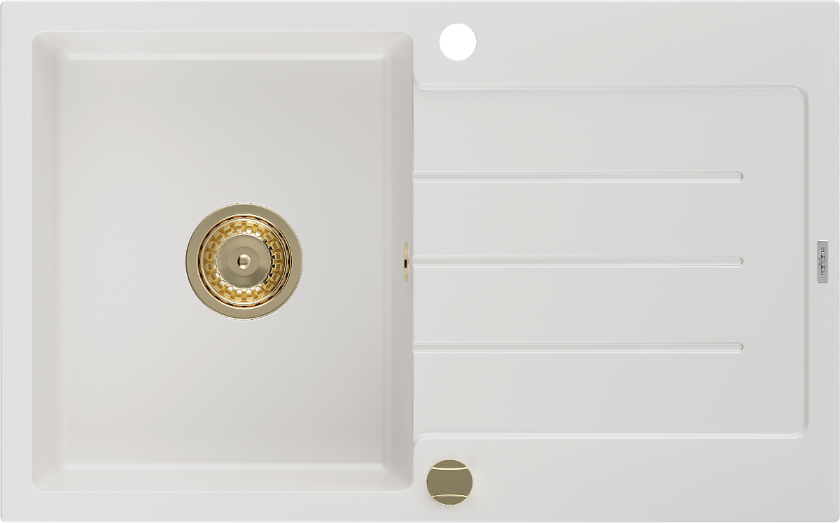 Mexen Bruno chiuvetă de granit cu 1 compartiment cu scurgător 795 x 495 mm, alb, sifon auriu - 6513791010-20-G