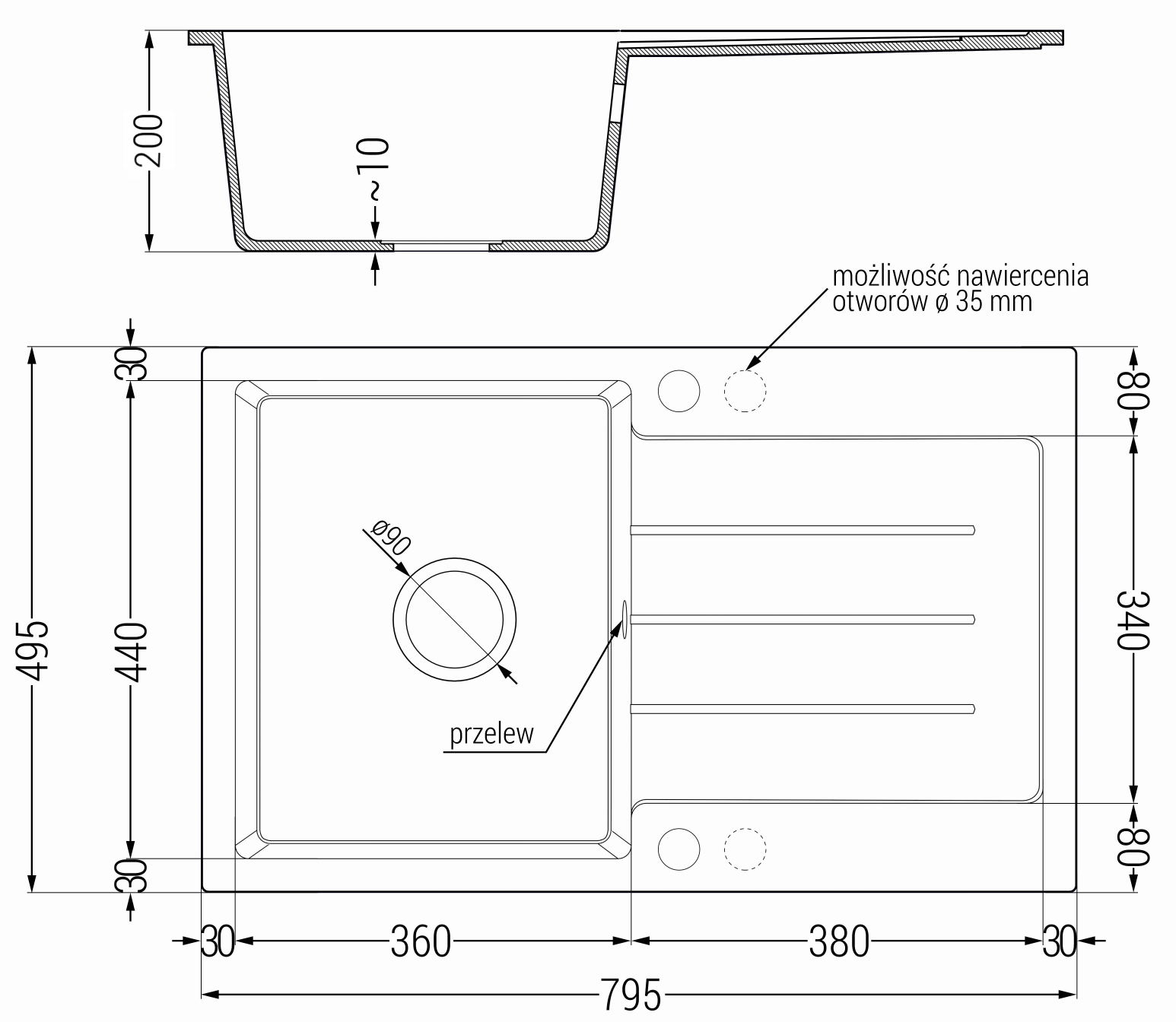 Chiuveta are 2 găuri legate cu un diametru de 35 mm, pentru auto -burst. Pot fi folosite, printre altele Pentru montarea unui distribuitor de lichid care va elimina prezența sticlelor de plastic în bucătărie și îi va oferi un finisaj elegant.