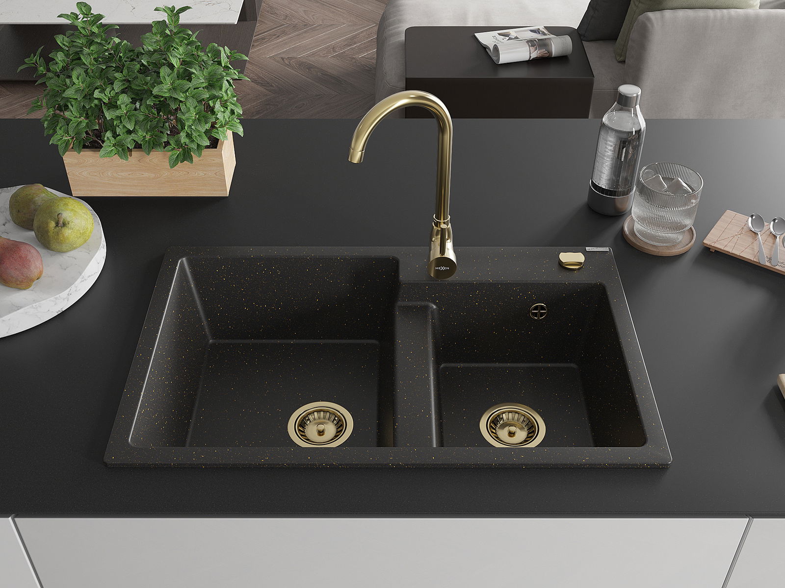 Mexen Tomas chiuvetă din granit 2 camere 800 x 500 mm, negru/auriu metalizat, sifon auriu - 6516802000-75-G