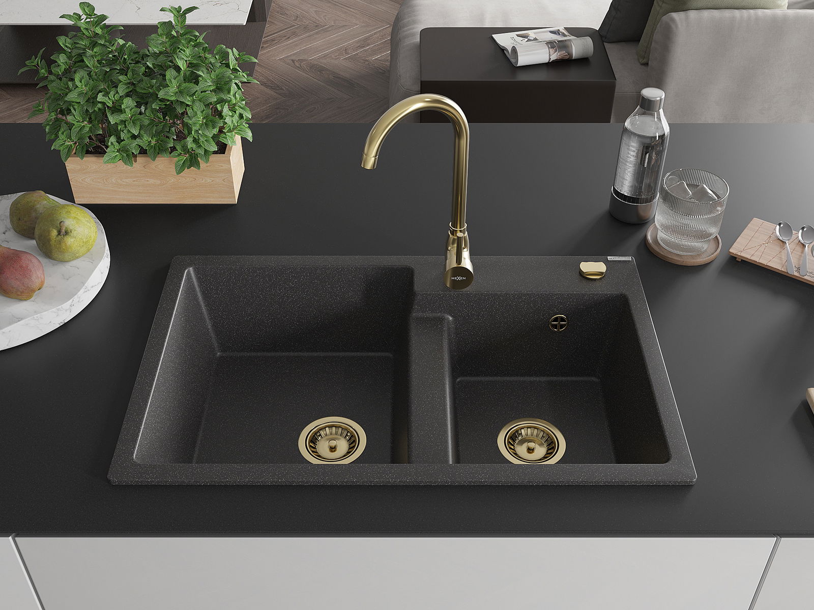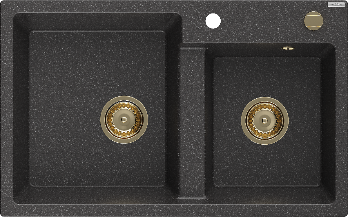 Mexen Tomas chiuvetă din granit cu 2 compartimente 800 x 500 mm, negru cu pete, sifon auriu - 6516802000-76-G