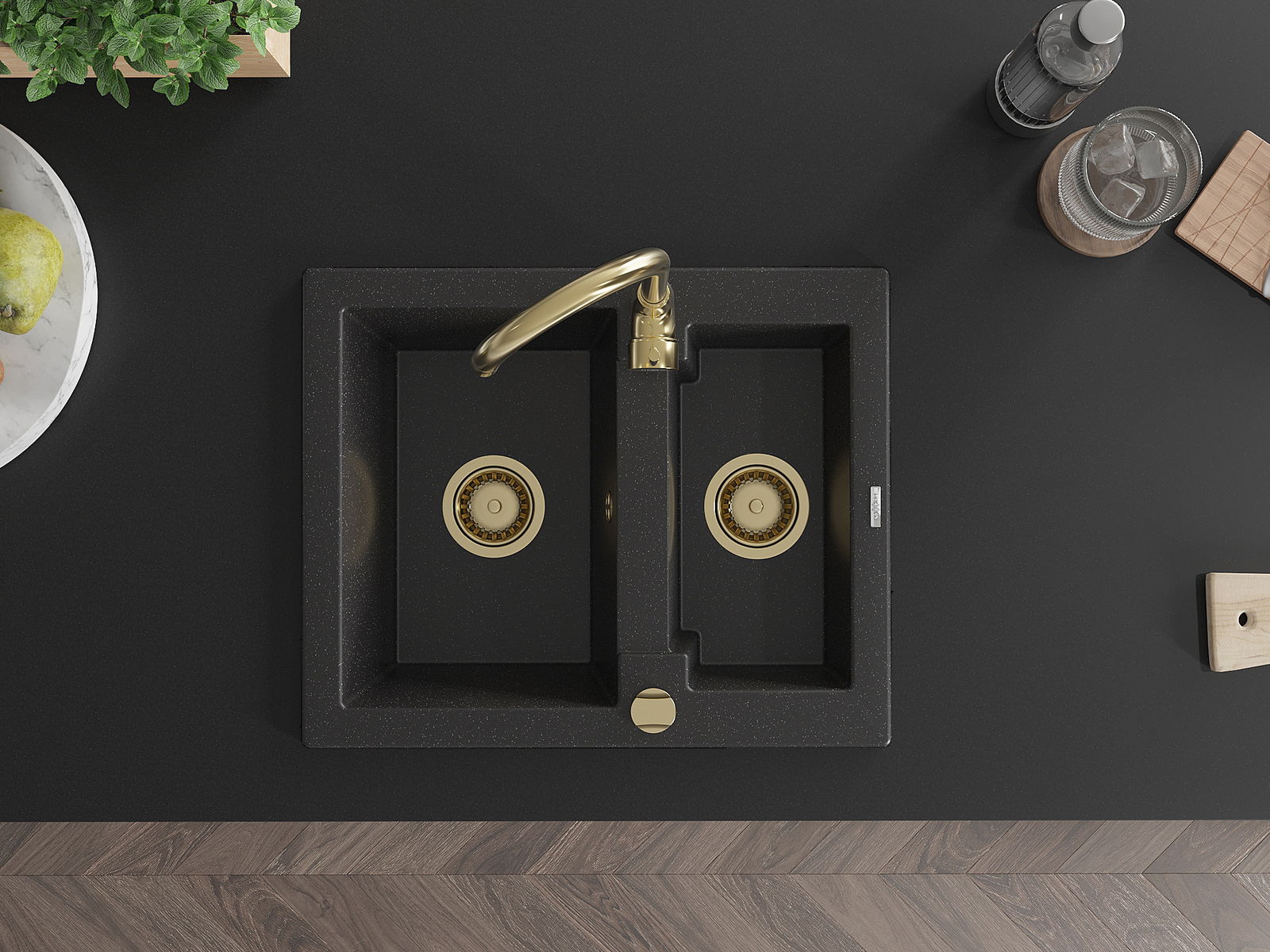 Mexen Carlos chiuvetă din granit, 1,5 camere, 582 x 475 mm, negru/argintiu metalic, sifon auriu - 6518581500-73-G