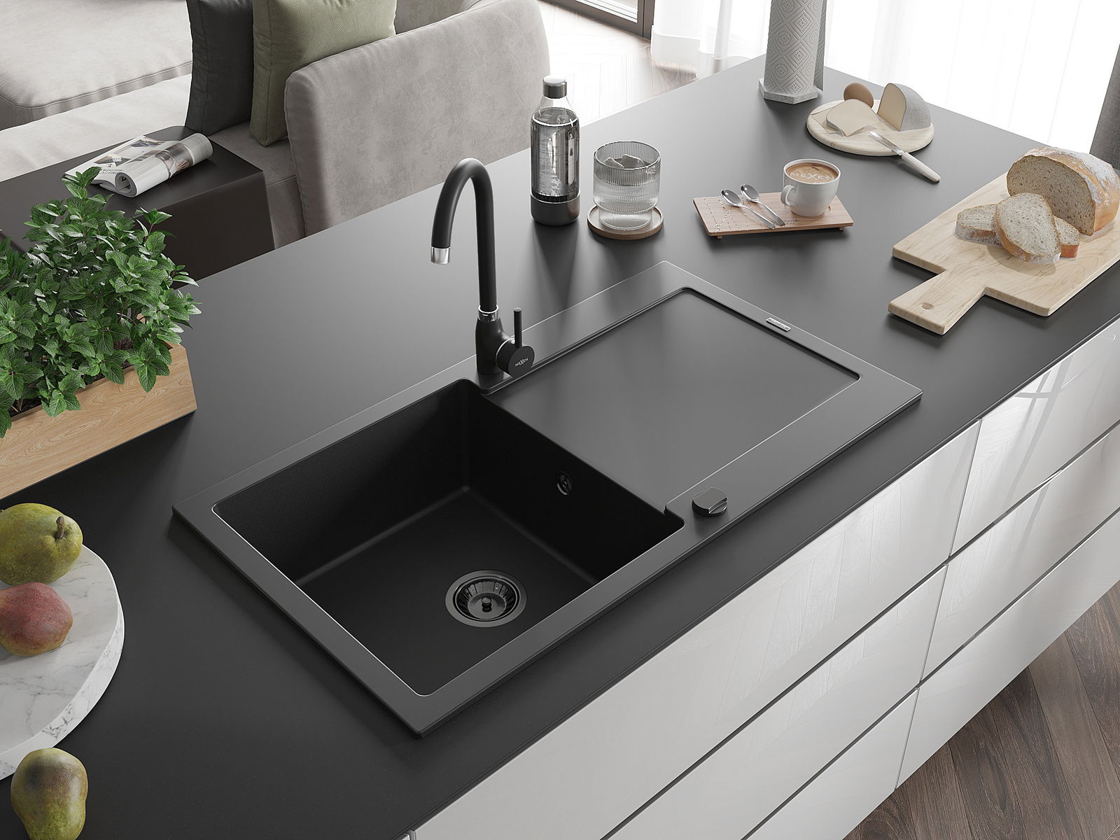 Mexen Leo chiuvetă de granit cu 1 compartiment cu scurgător 900 x 500 mm, negru, sifon negru - 6501901010-77-B