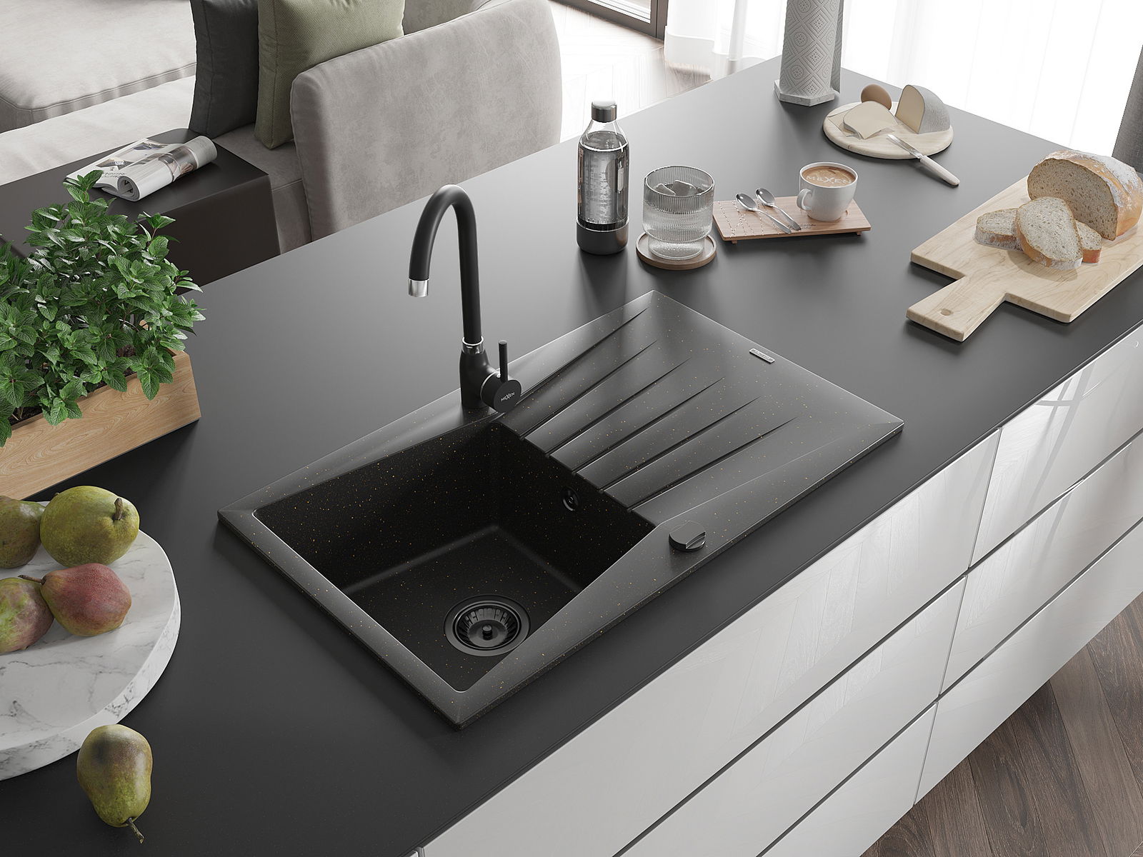 Mexen Cesar chiuvetă de granit cu 1 compartiment cu scurgător 775 x 470 mm, negru/auriu metalizat, sifon negru - 6514771010-75-?