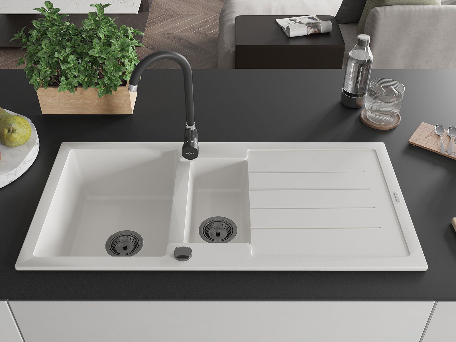 Mexen Andres chiuvetă granit 1,5 compartiment cu scurgător 1000 x 500 mm, alb, sifon negru - 6515101510-20-B