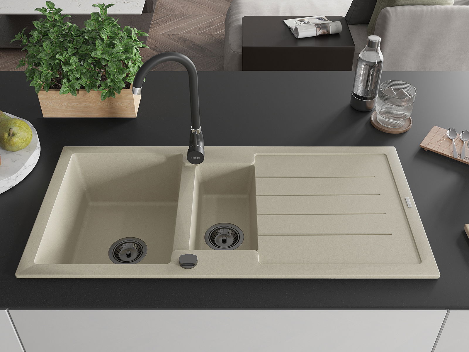 Mexen Andres chiuvetă din granit cu 1,5 compartimente și picurător 1000 x 500 mm, bej, sifon negru - 6515101510-69-B