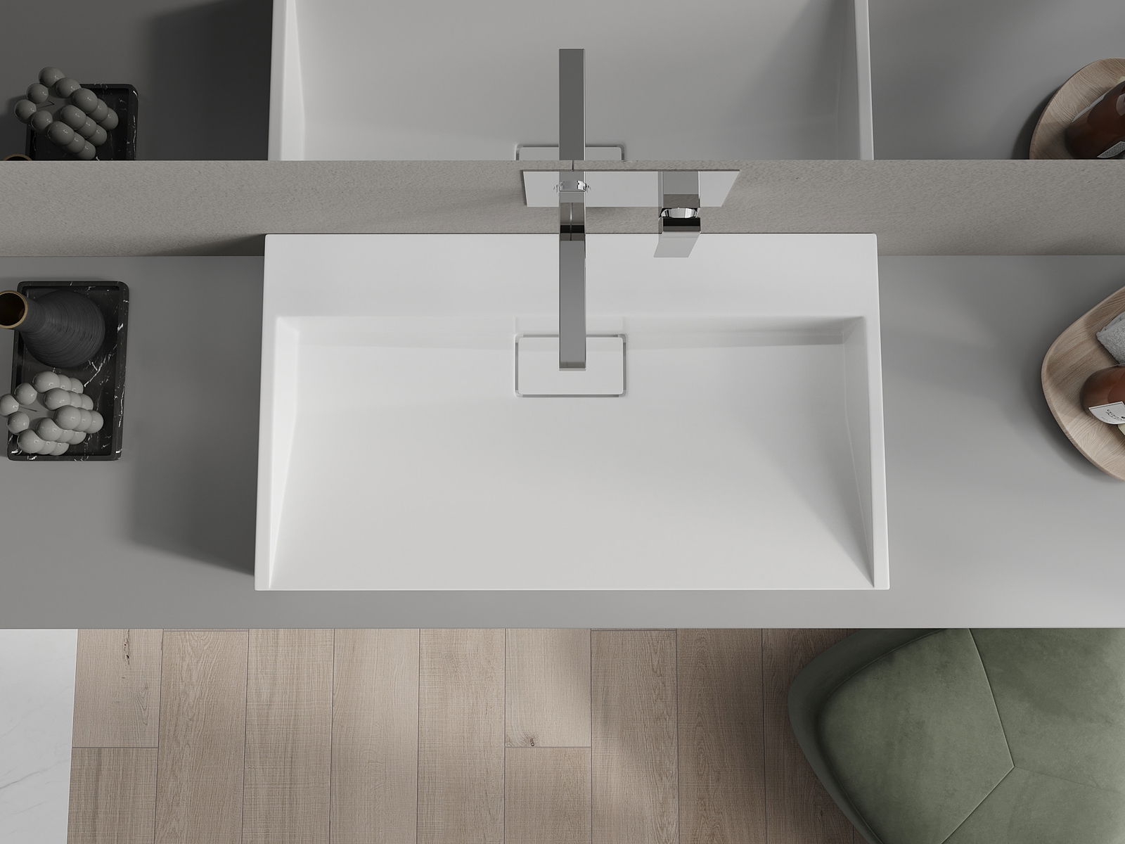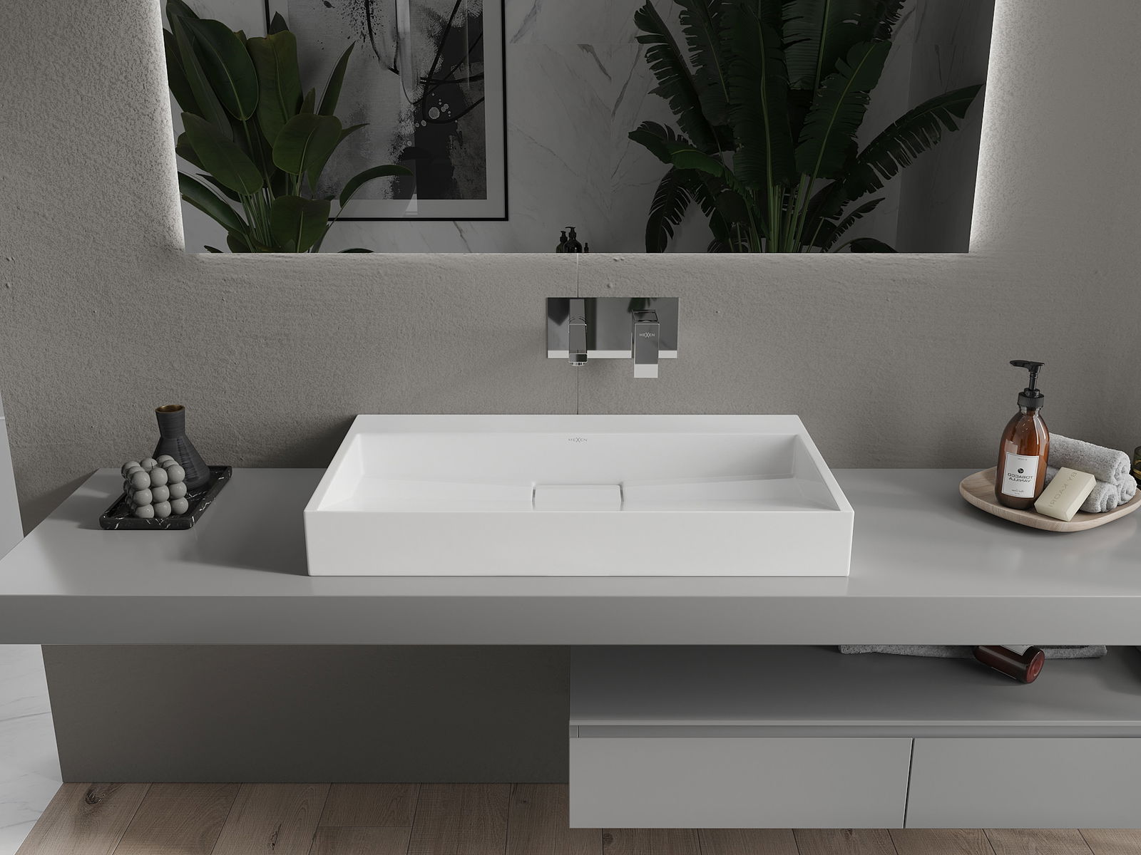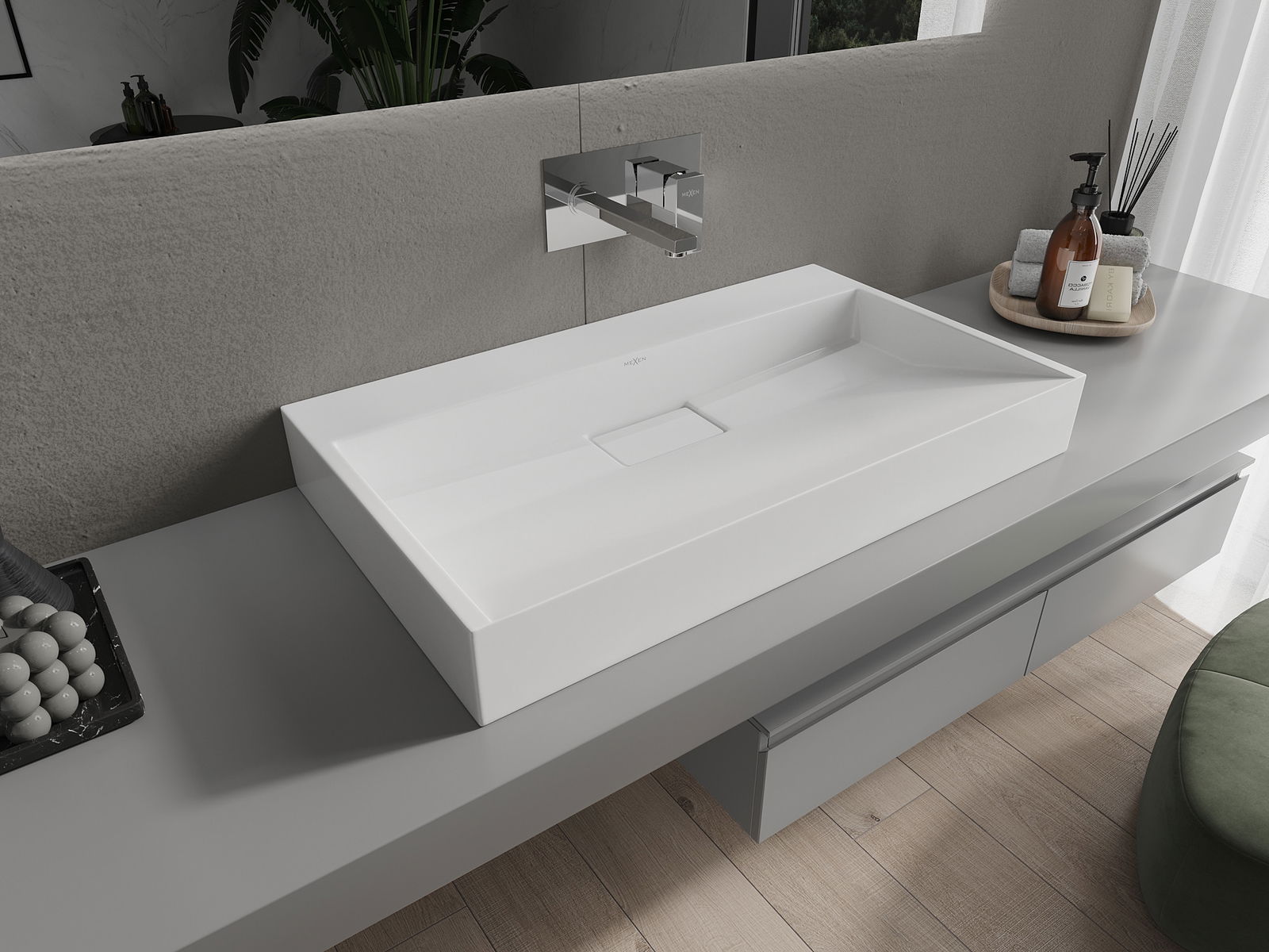 Chiuvetă deasupra blatului din conglomerat cu dimensiunile 80 x 46 cm, în culoarea albă, este soluția ideală pentru băile moderne. Datorită formei sale dreptunghiulare și construcției specializate, produsul se încadrează perfect în tendințele de design, oferind concomitent funcționalitate. Înălțimea mică de 11 cm face ca chiuveta să fie confortabilă în utilizare. Materialul conglomerat asigură durabilitate și ușurință în întreținere. Lipsa orificiilor pentru baterie permite o mai mare libertate în alegerea armăturii.