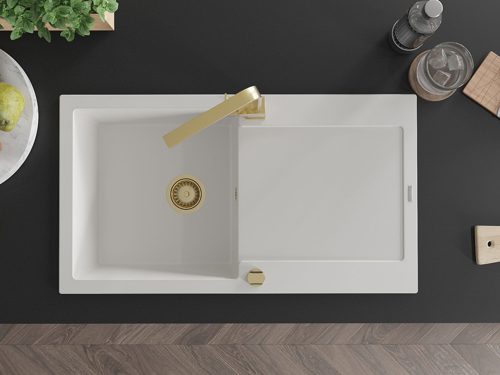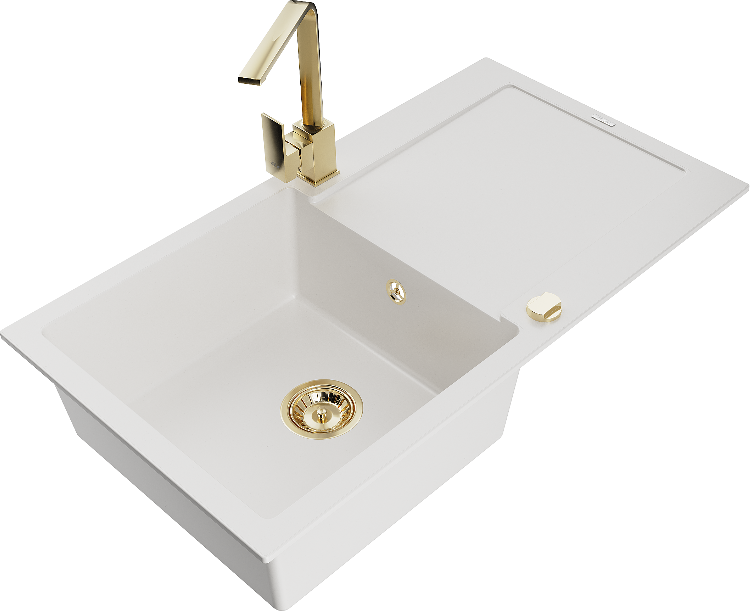 Mexen Leo chiuvetă de granit cu 1 compartiment și scurgător și baterie de bucătărie Rita, alb - 6501-20-670300-50