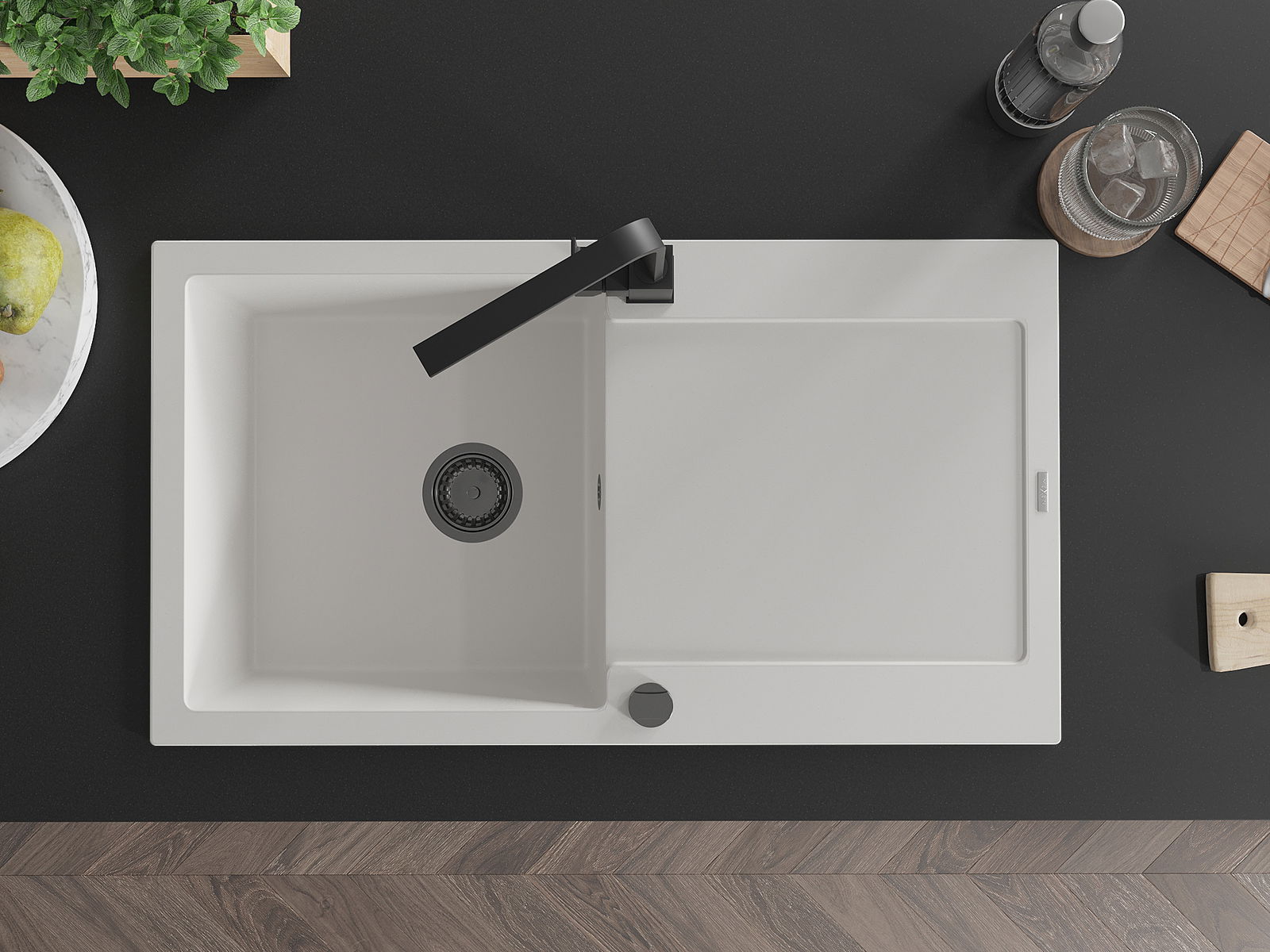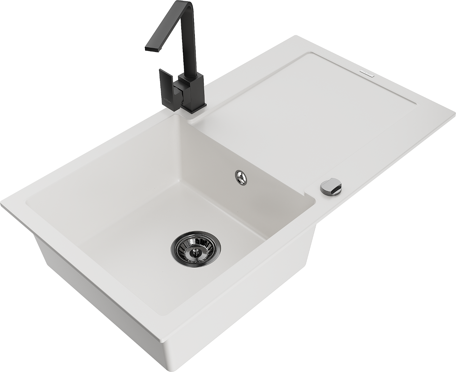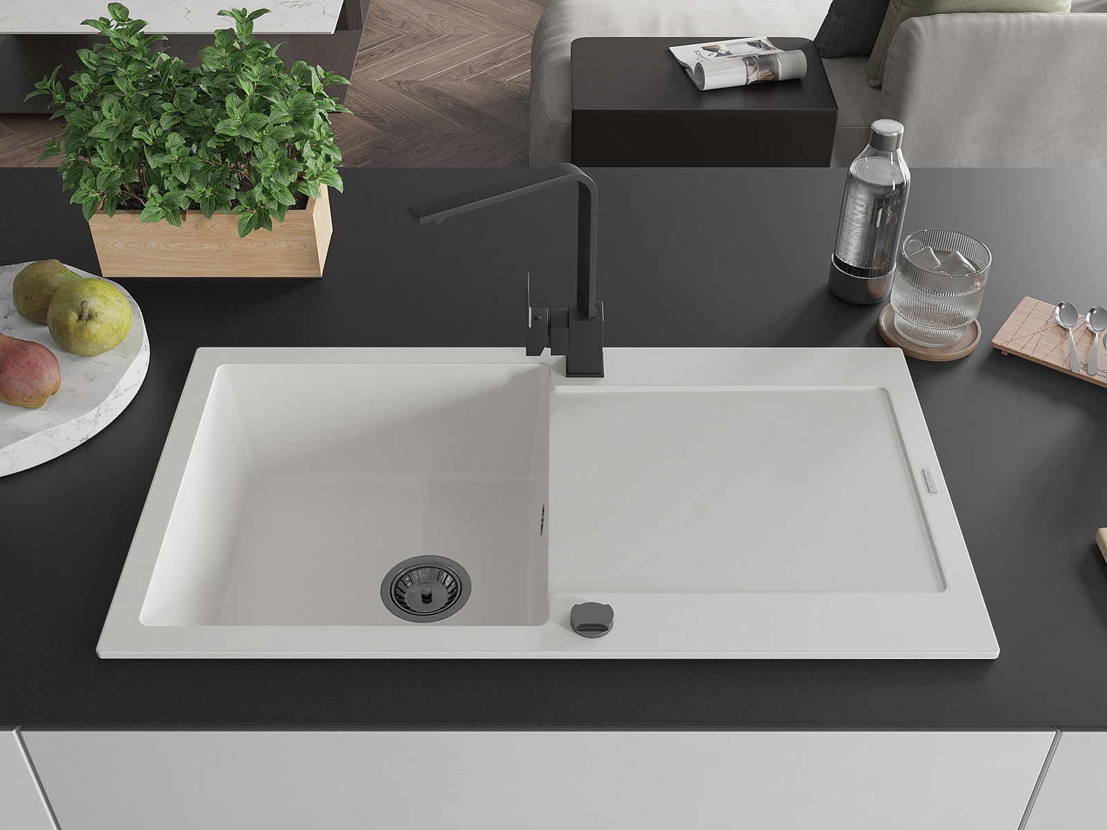 Mexen Leo chiuvetă de granit cu 1 compartiment cu scurgător și baterie de bucătărie Rita, alb - 6501-20-670300-70