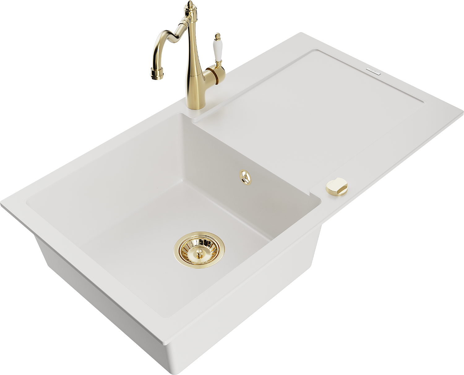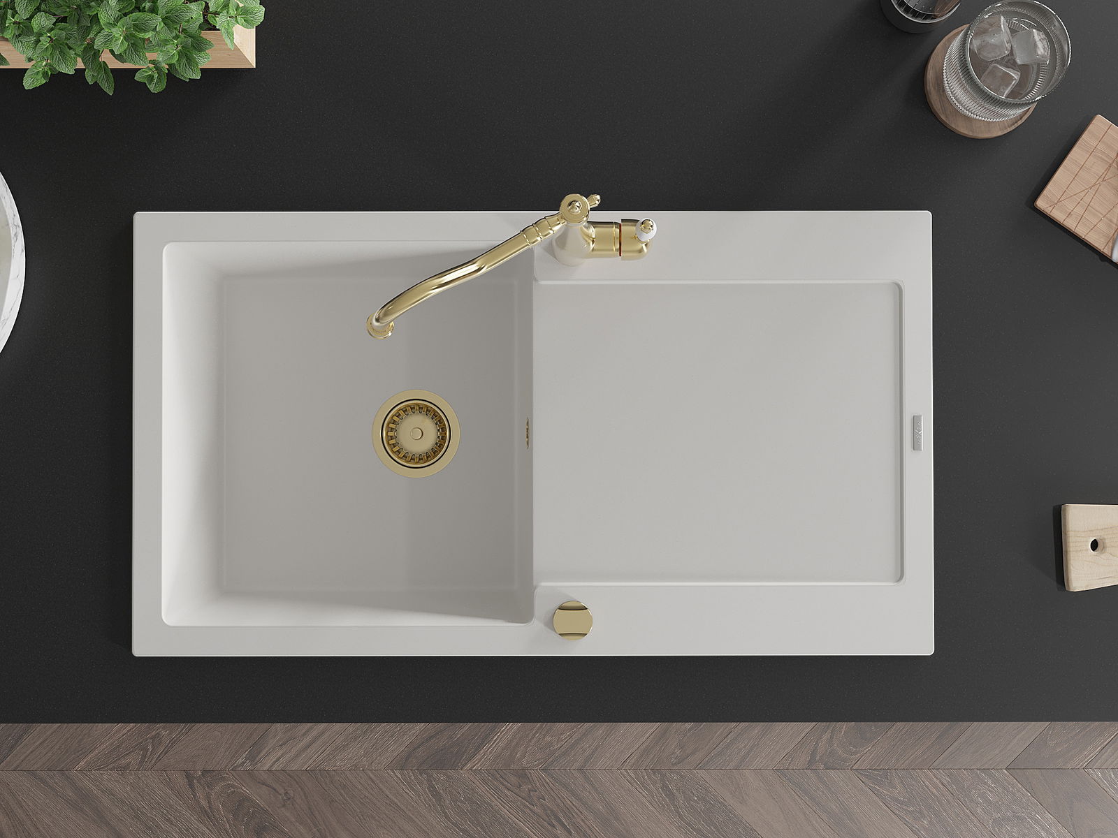 Mexen Leo chiuvetă de granit 1-cameră cu scurgător și baterie de bucătărie Carla, alb - 6501-20-670700-50