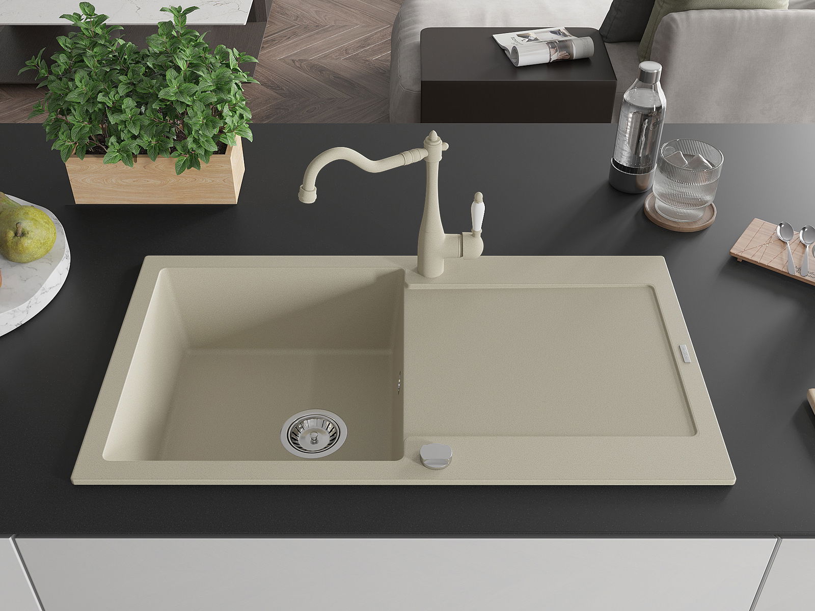 Mexen Leo chiuvetă granit 1-cameră cu scurgător și robinet de bucătărie Carla, bej - 6501-69-670700-69