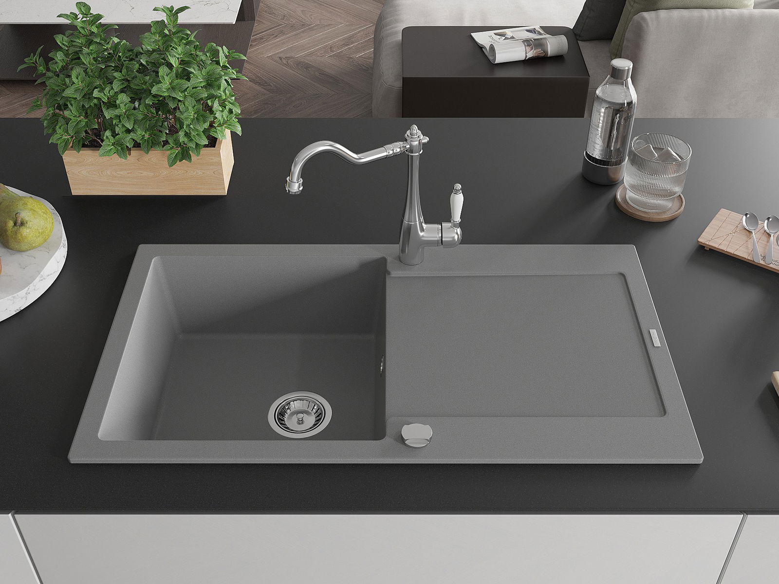 Suprafața chiuvetei este rezistentă la pete și decolorarea, datorită căreia este ușor de curățat și își păstrează culoarea mult timp. Estetică și practic completarea fiecărei bucătării.