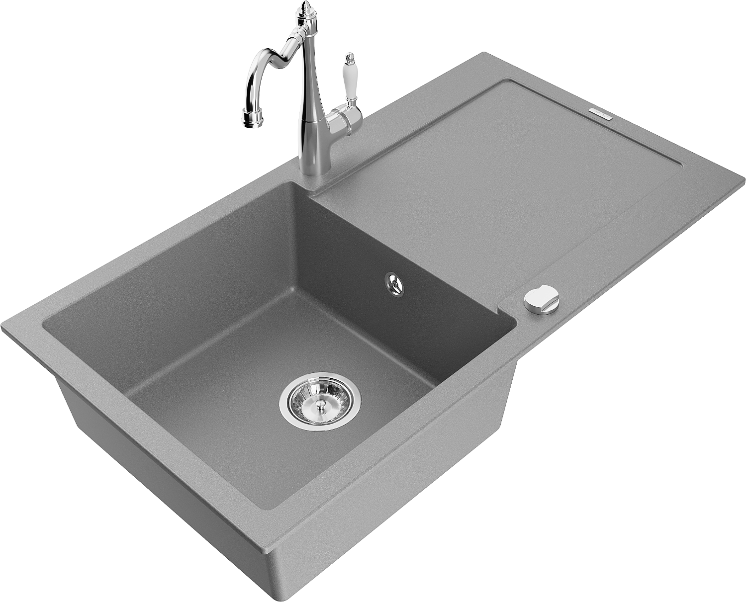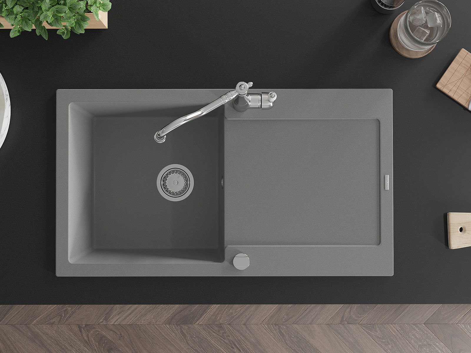 Mexen Leo chiuvetă de granit cu o singură cuvă cu scurgător și baterie de bucătărie Carla, gri - 6501-71-670700-00