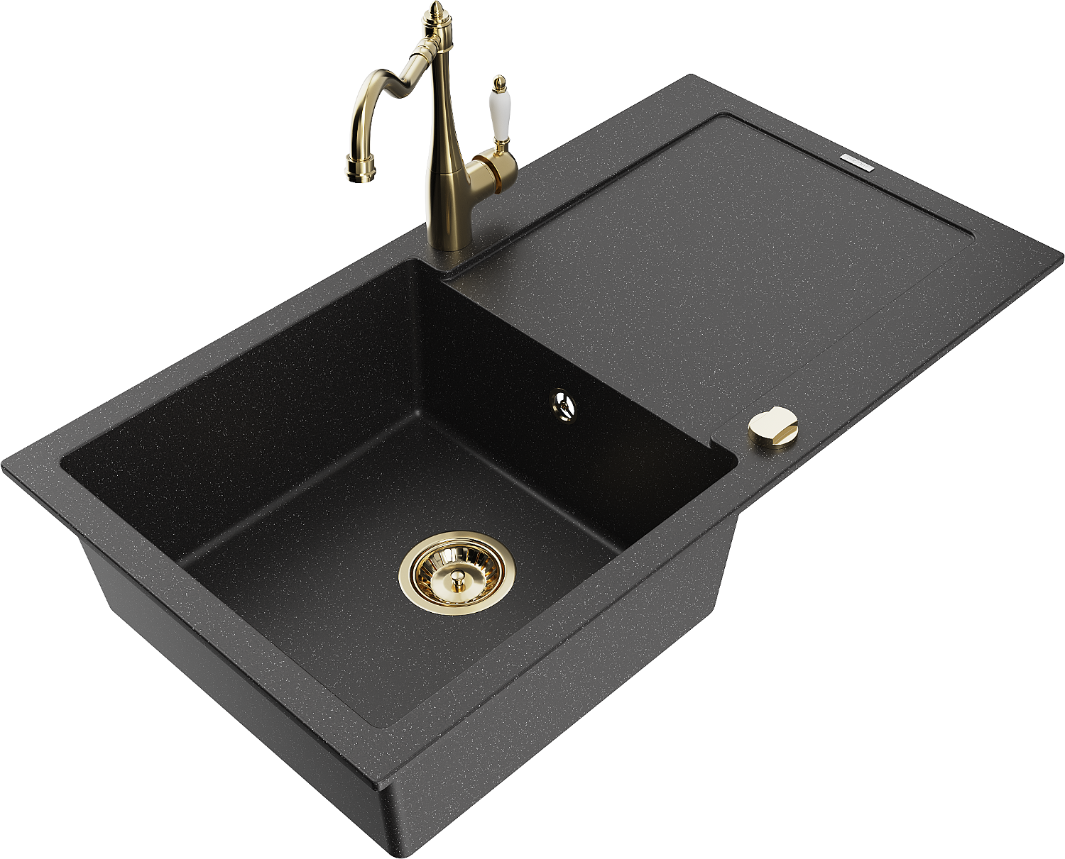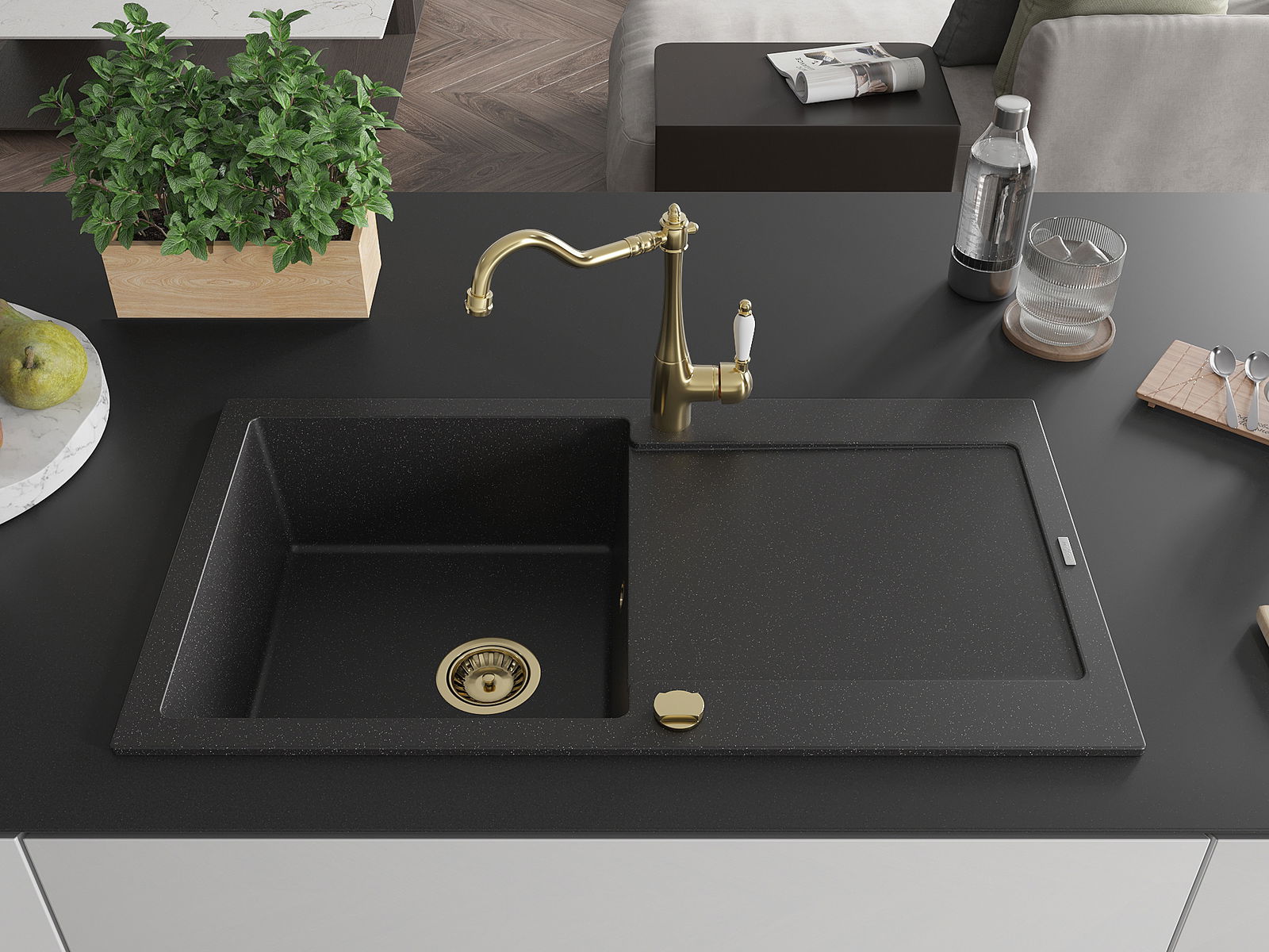Mexen Leo chiuvetă din granit cu 1 compartiment și picurător și baterie de bucătărie Carla, negru/argintiu metalizat - 6501-73-?