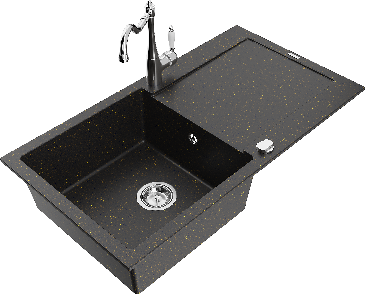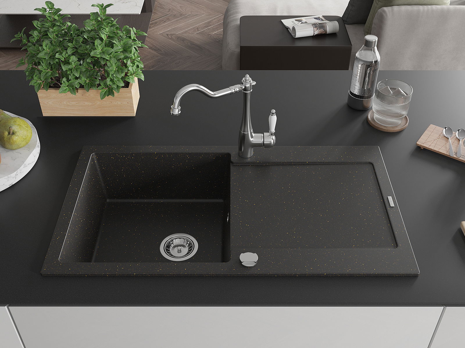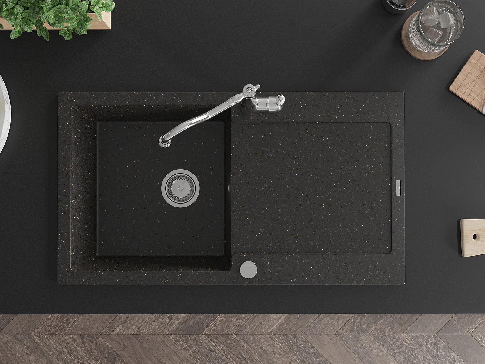 Mexen Leo chiuvetă de granit cu 1 compartiment cu scurgător și baterie de bucătărie Carla, negru/auriu metalizat