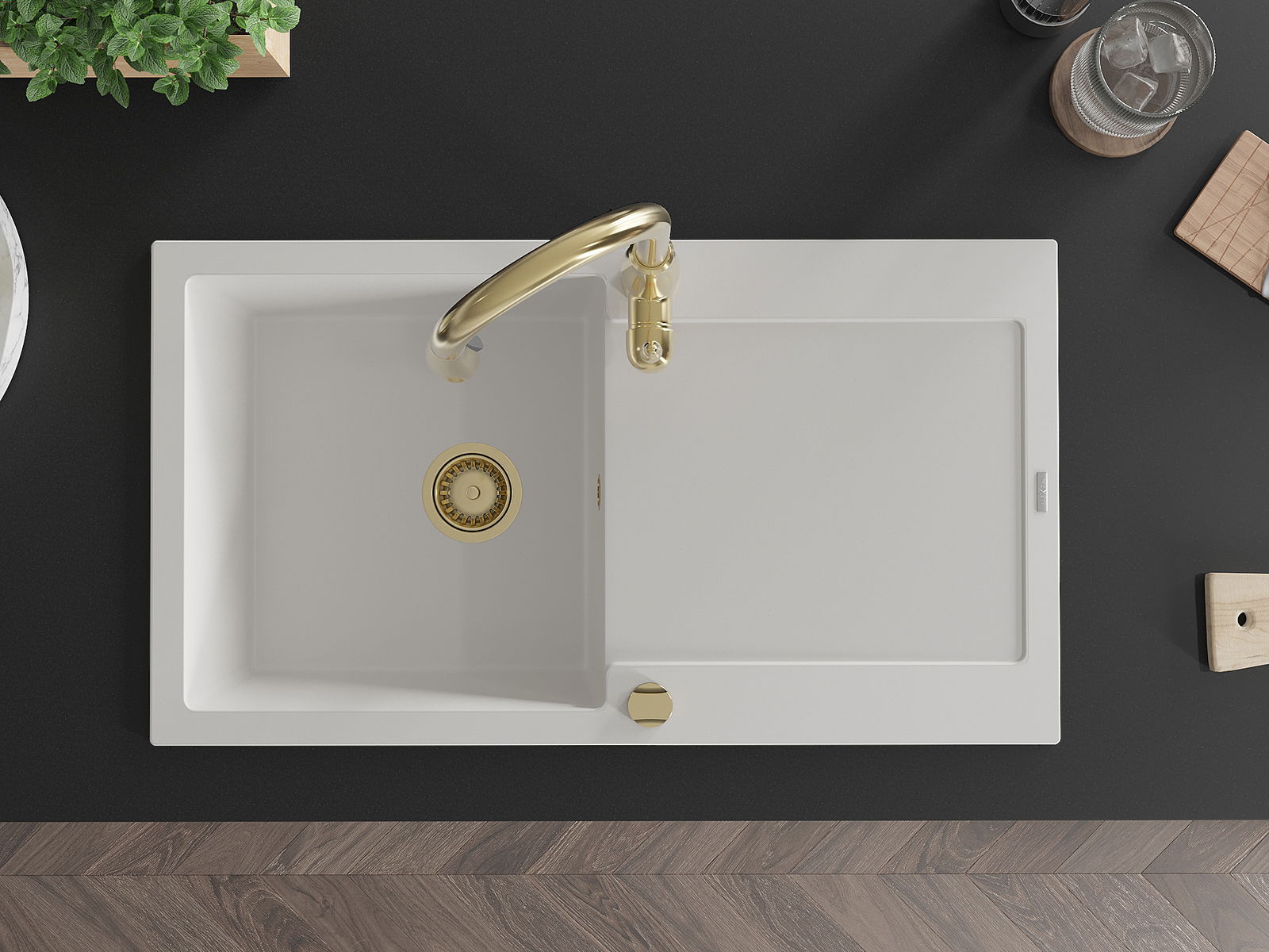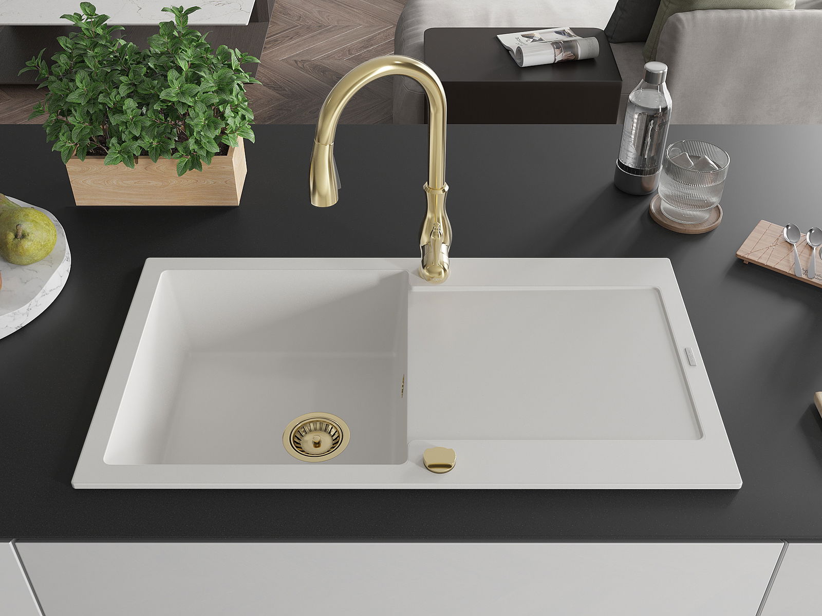 Mexen Leo chiuvetă de bucătărie din granit cu 1 cuvă și scurgător cu baterie de bucătărie Savita, alb - 6501-20-672601-50