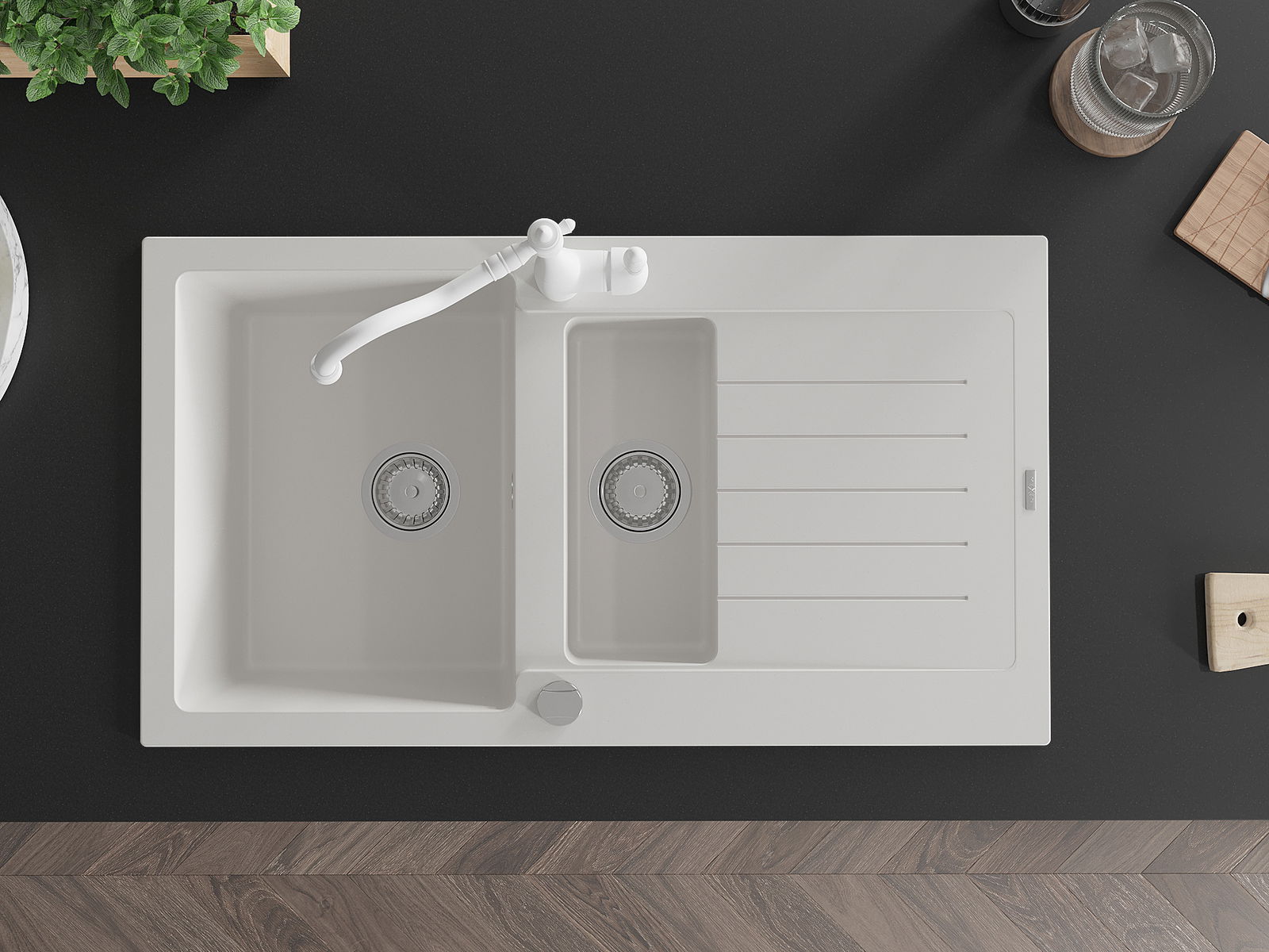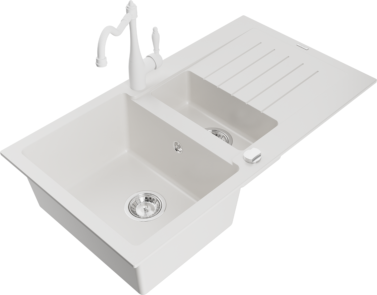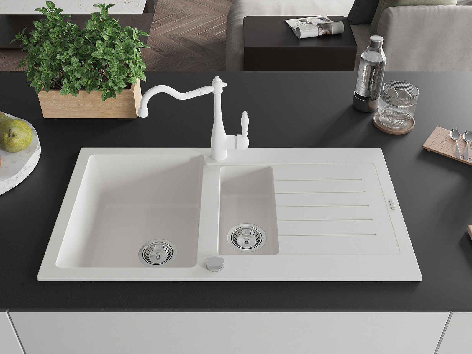 Mexen Matias chiuvetă de granit cu 1,5 compartimente cu scurgător și baterie de bucătărie Carla, albă - 6502-20-670700-20