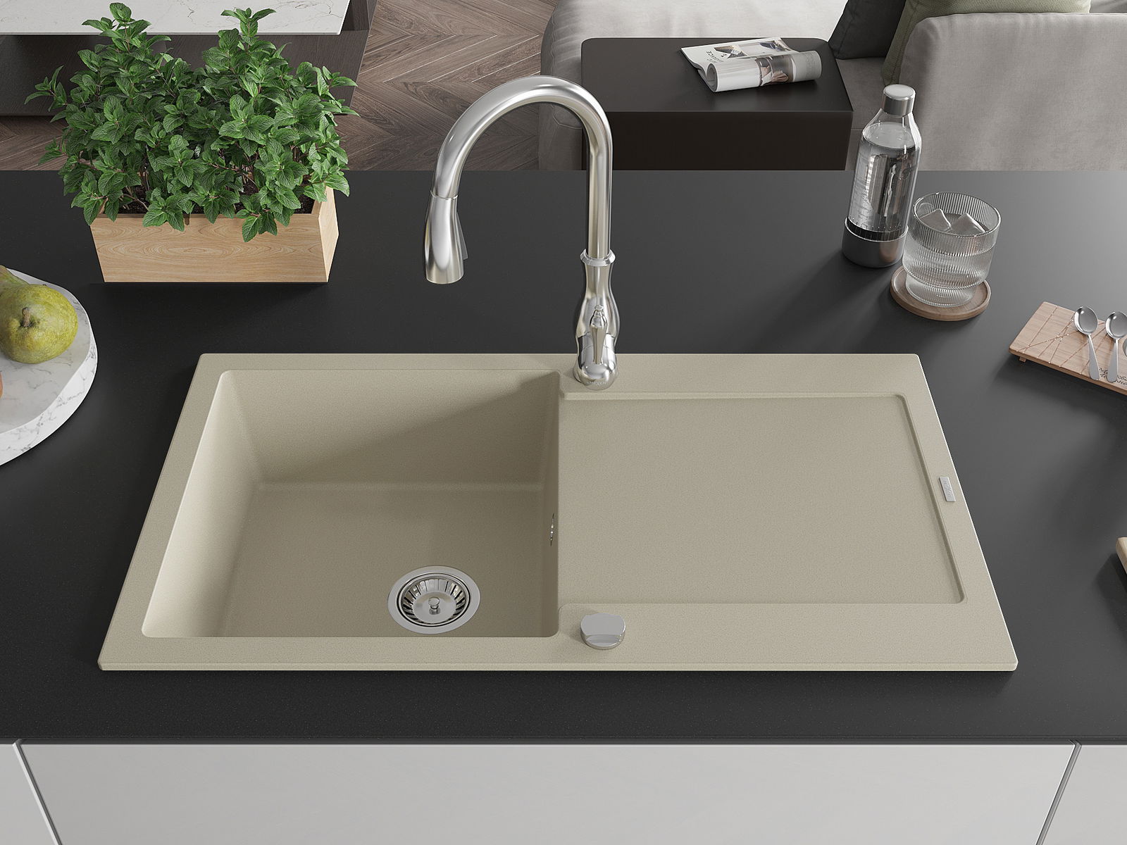 Suprafața chiuvetei este rezistentă la pete și decolorarea, datorită căreia este ușor de curățat și își păstrează culoarea mult timp. Estetică și practic completarea fiecărei bucătării.