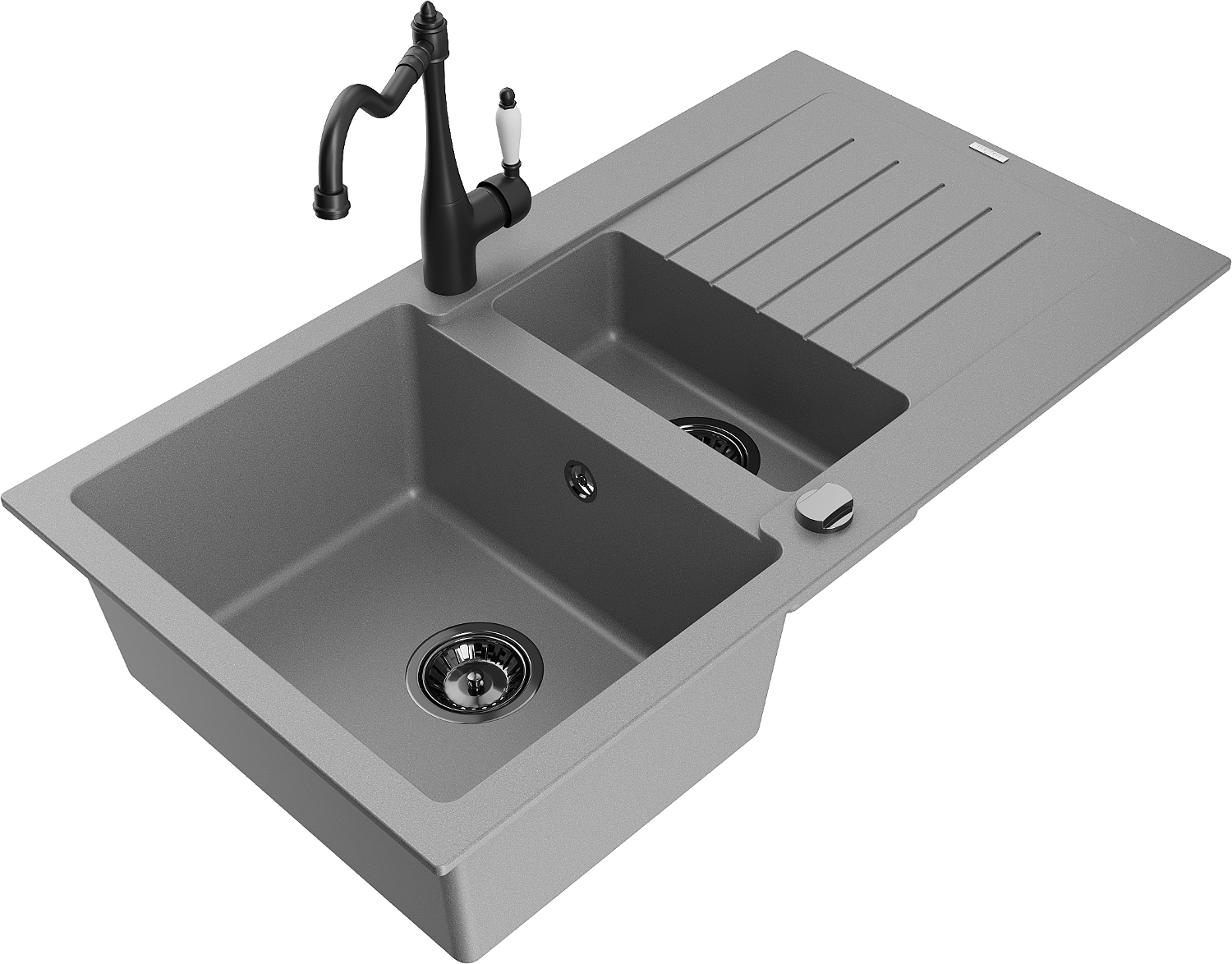 Mexen Matias chiuvetă din granit cu 1,5 compartimente cu scurgător și baterie de bucătărie Carla, gri - 6502-71-670700-70-B