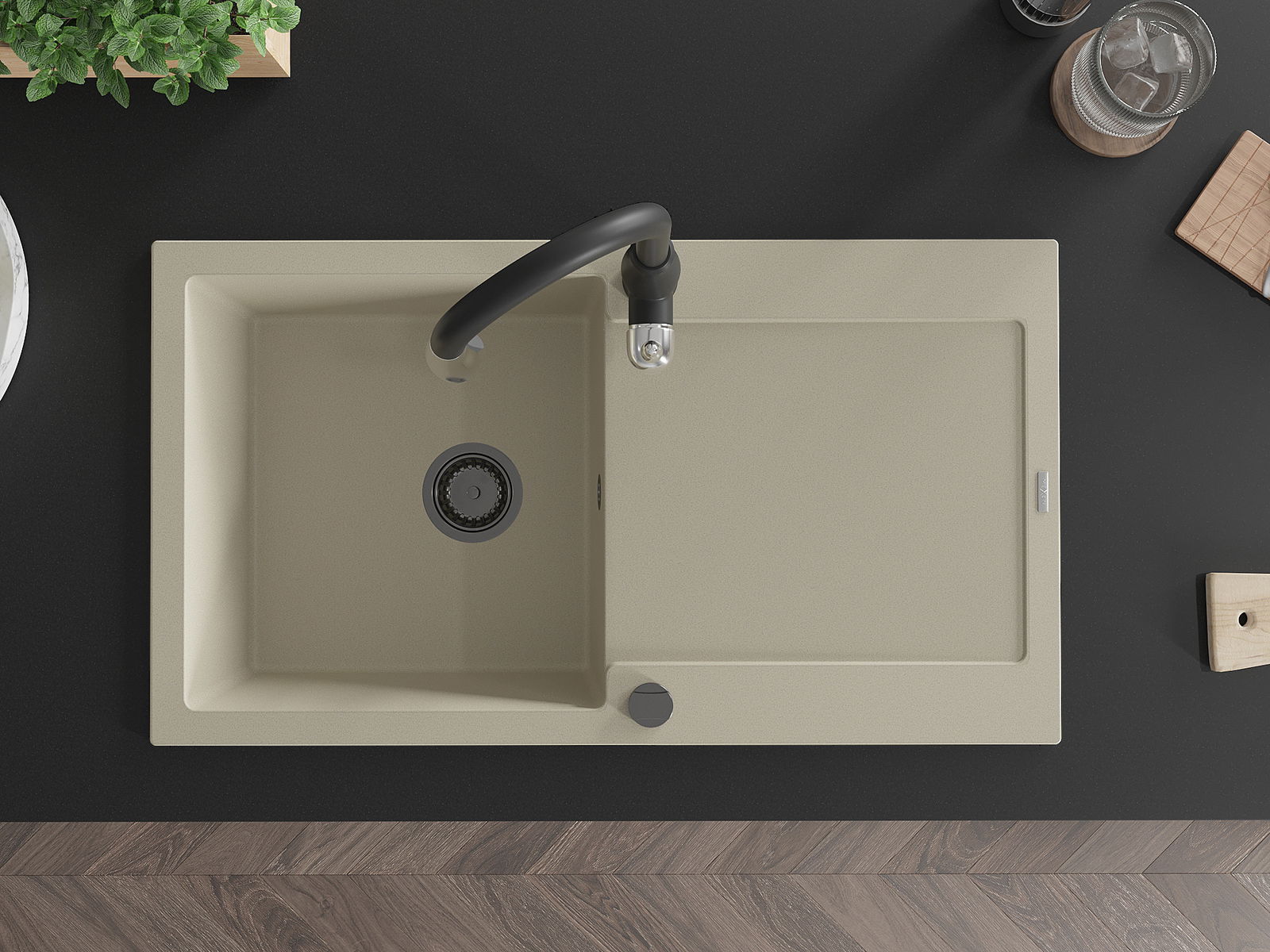 Mexen Leo chiuvetă de bucătărie din granit cu 1 cuvă și picurător și baterie de bucătărie Savita, bej - 6501-69-672601-70
