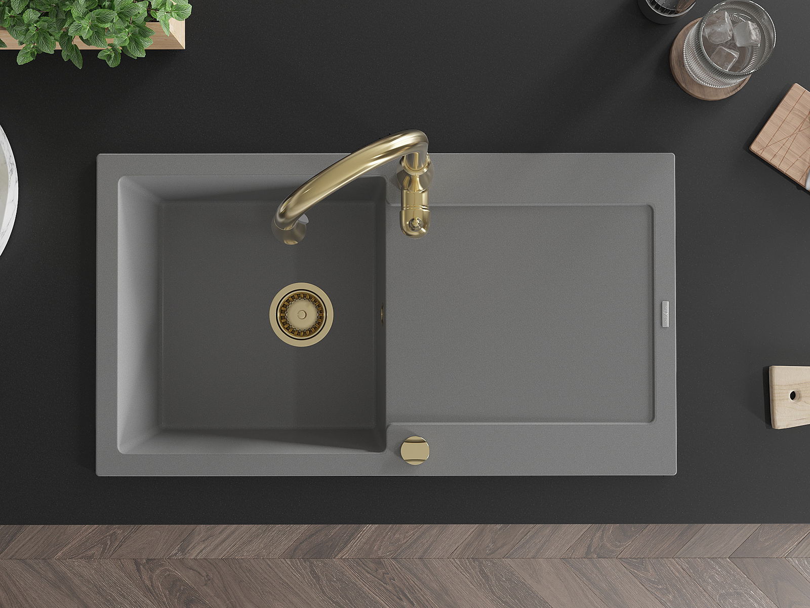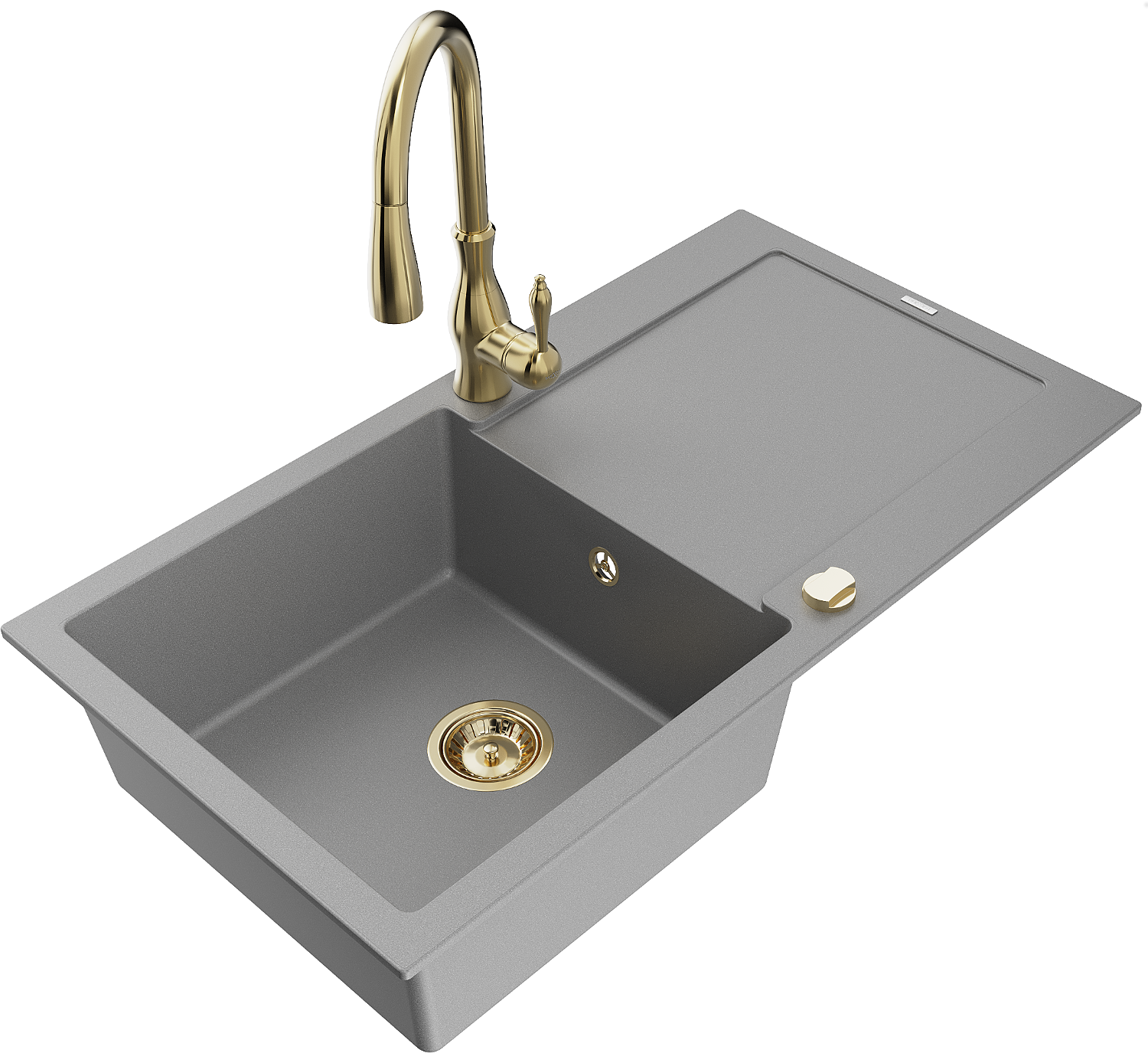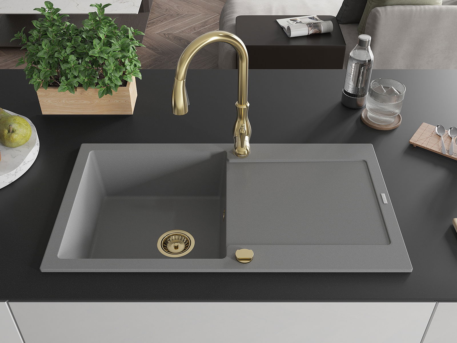 Mexen Leo chiuvetă din granit cu 1 cuvă cu picurător și baterie de bucătărie Savita, gri - 6501-71-672601-50