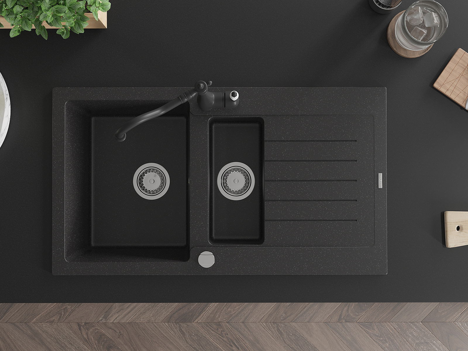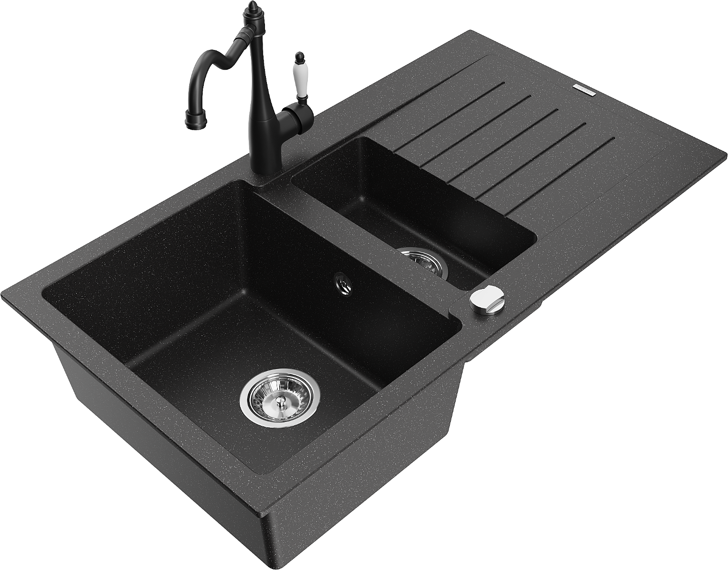 Mexen Matias chiuvetă de bucătărie din granit cu 1,5 compartimente cu scurgător și baterie Carla negru/argintiu metalizat