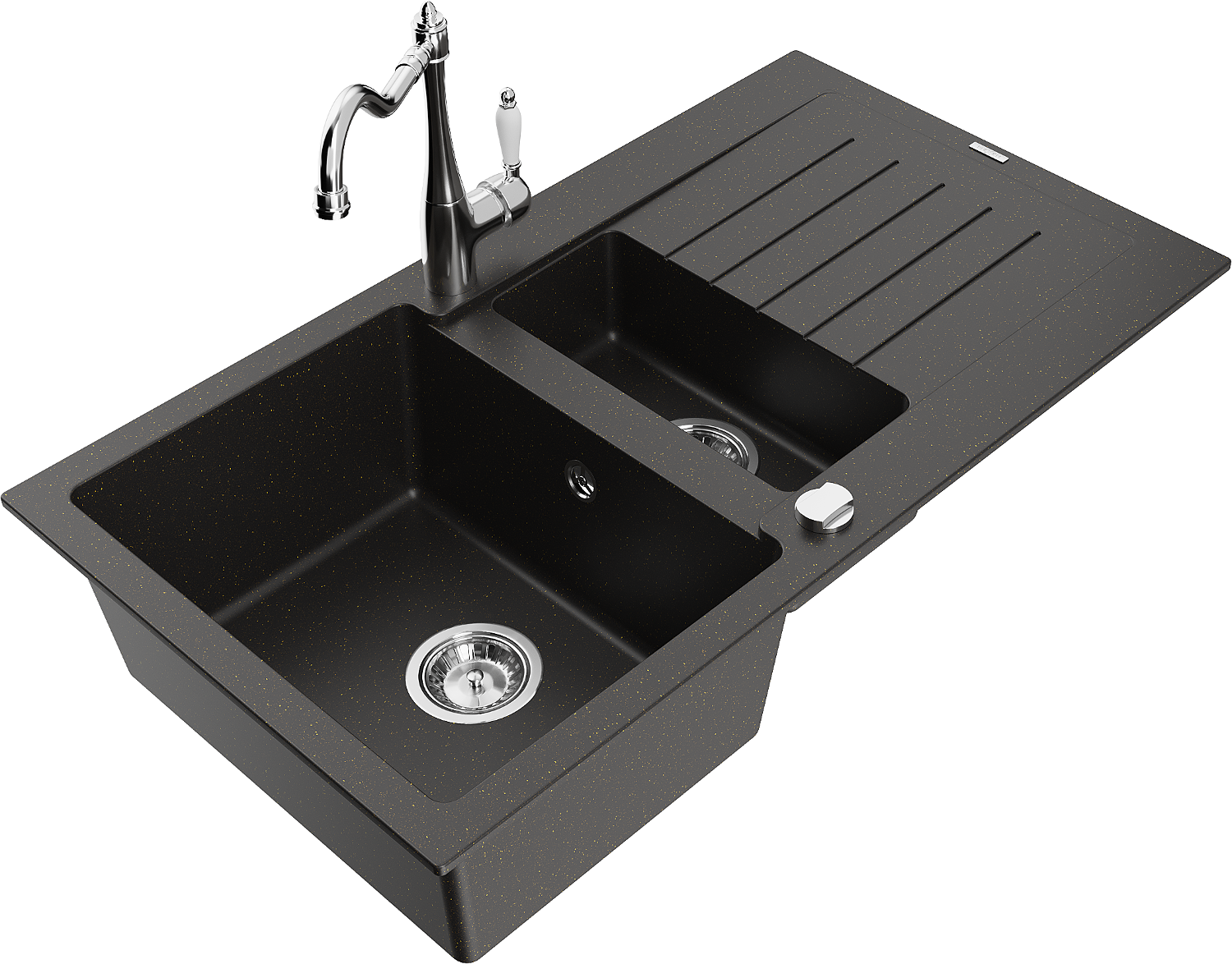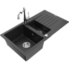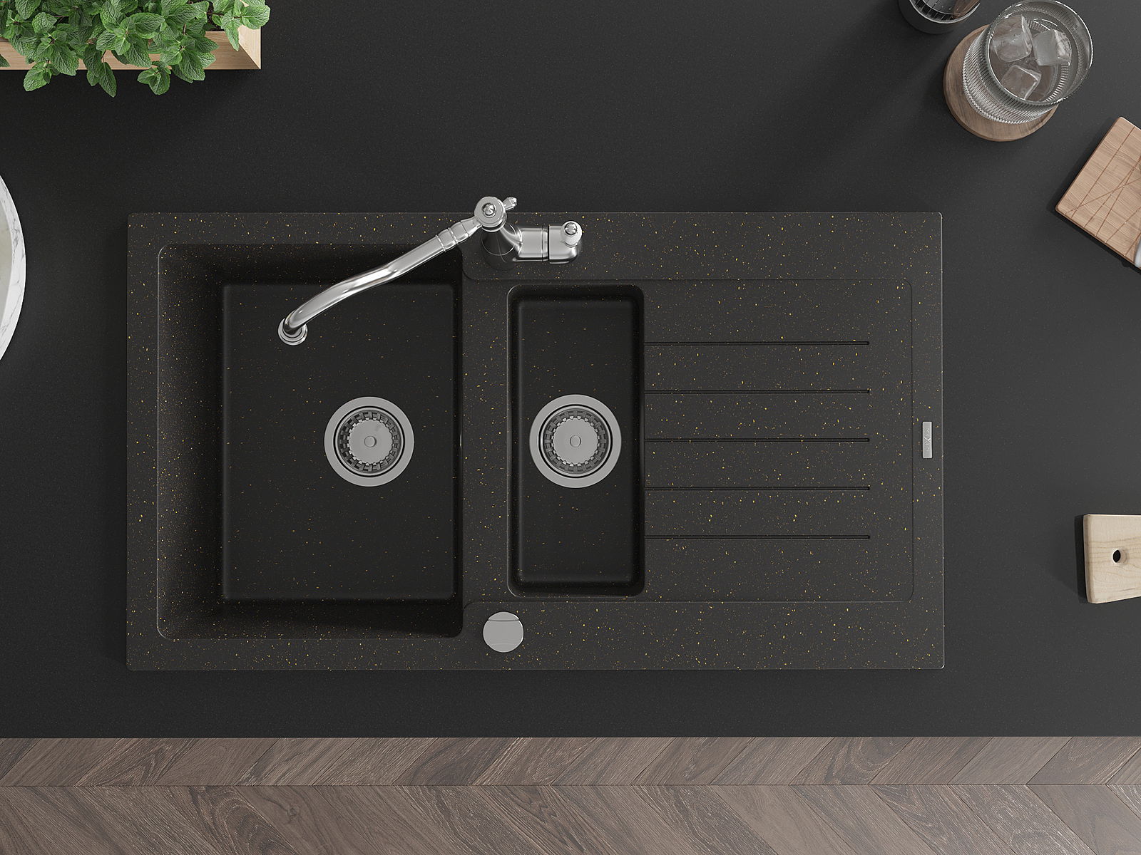 Mexen Matias chiuvetă de granit cu 1,5 cuve și scurgător, baterie de bucătărie Carla, negru/auriu metalic