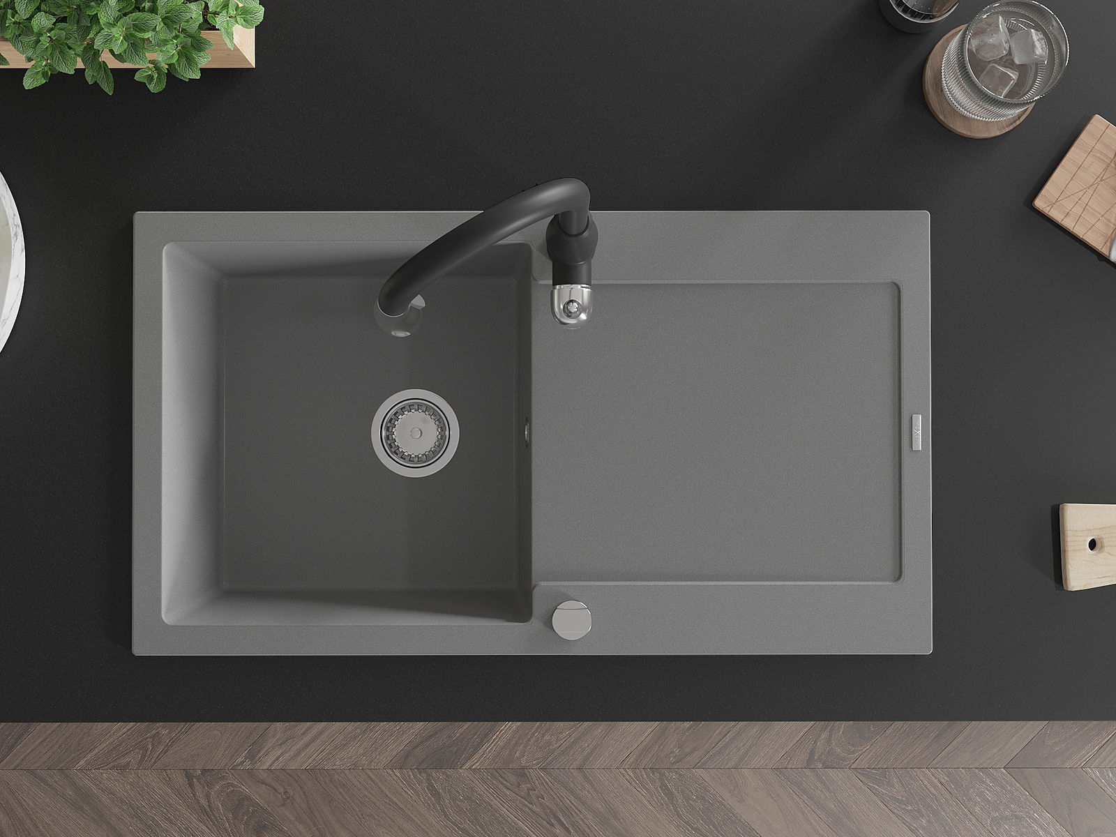 Mexen Leo chiuvetă de granit cu 1 compartiment cu suport de scurgere și baterie de bucătărie Savita, gri - 6501-71-672601-70