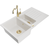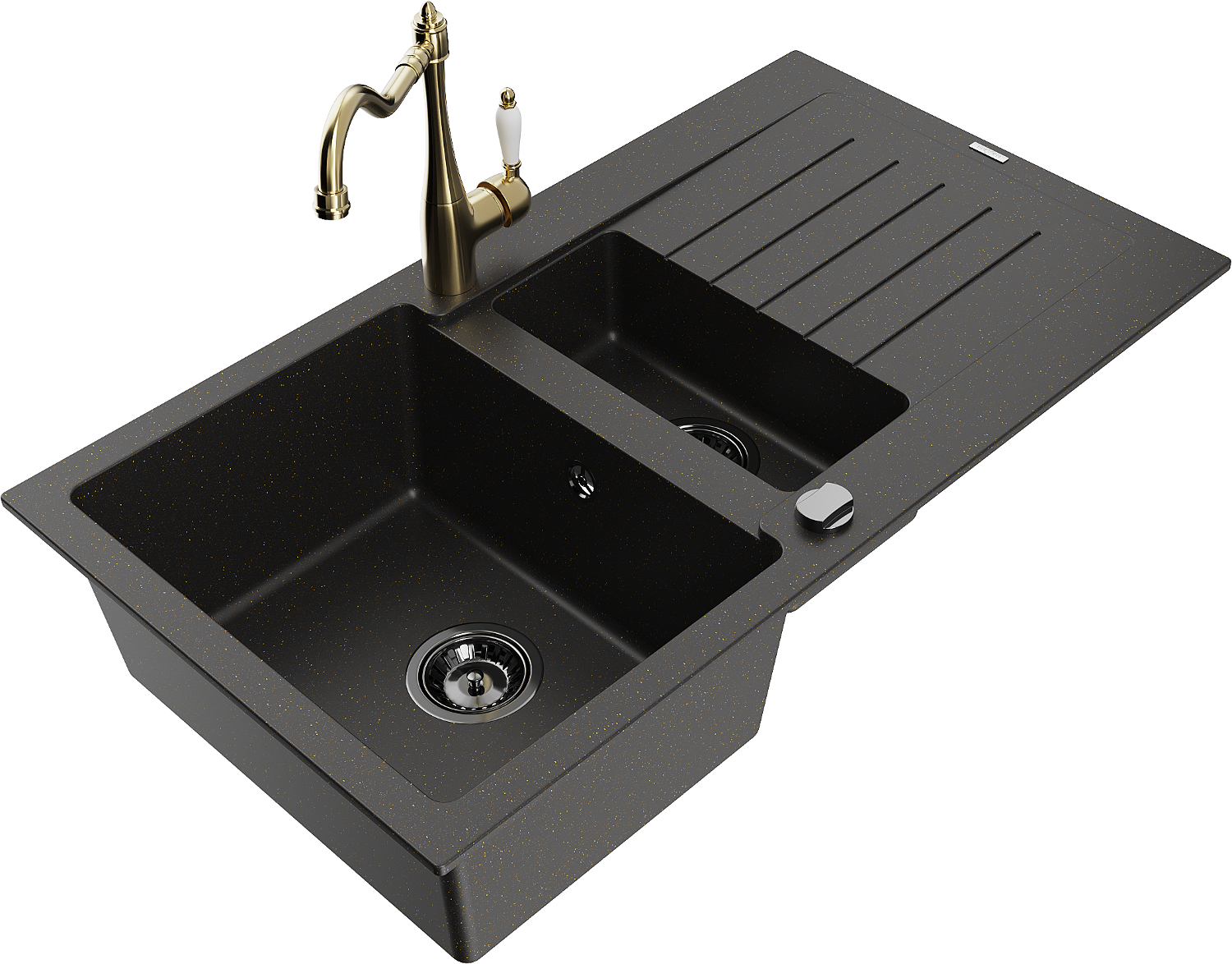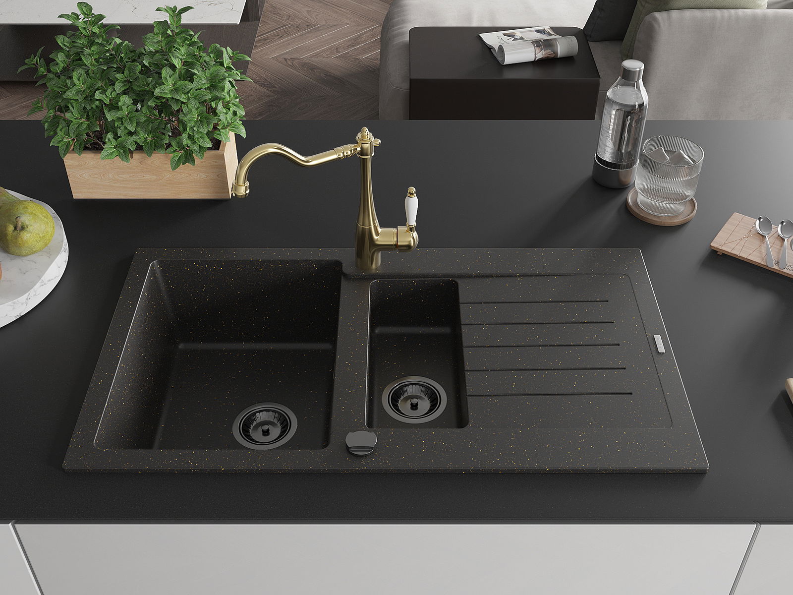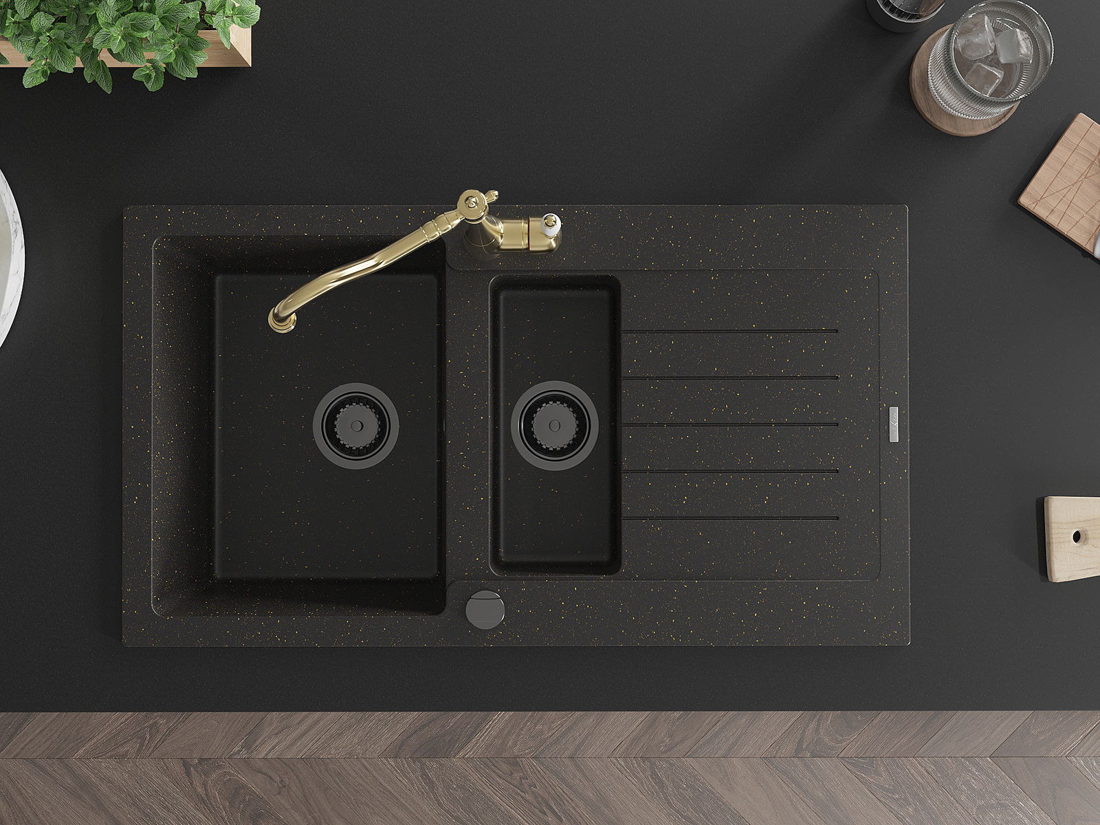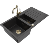 Mexen Matias chiuvetă de granit cu 1,5 compartimente și picurător și baterie de bucătărie Carla, negru/auriu metalic