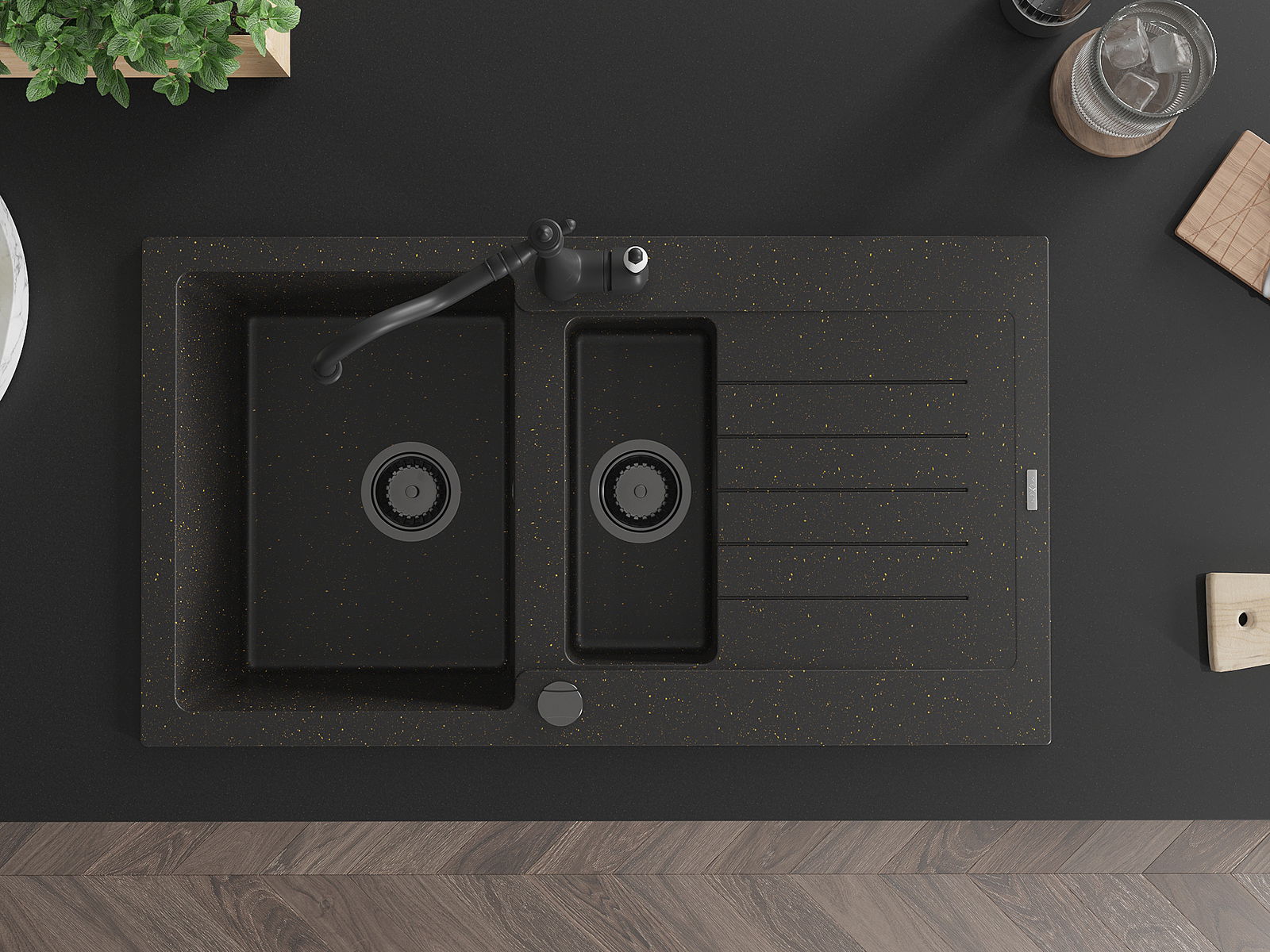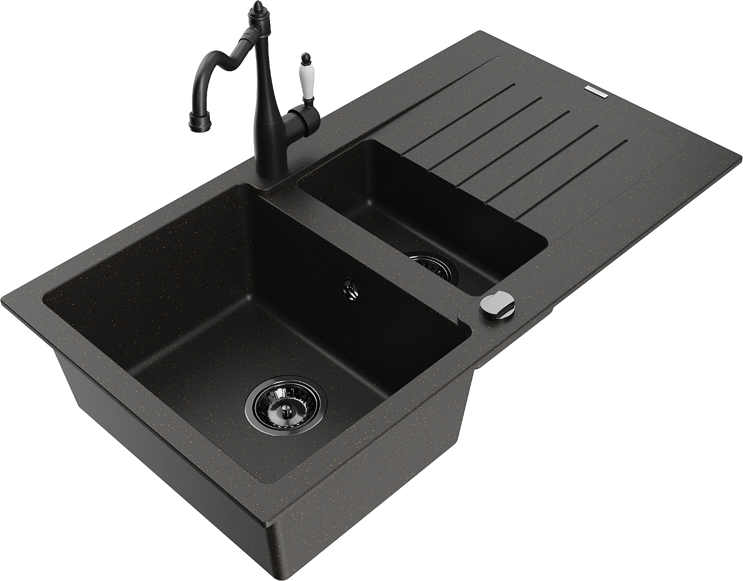 Mexen Matias chiuvetă de granit cu 1,5 compartimente cu scurgător și baterie de bucătărie Carla negru/auriu metalic