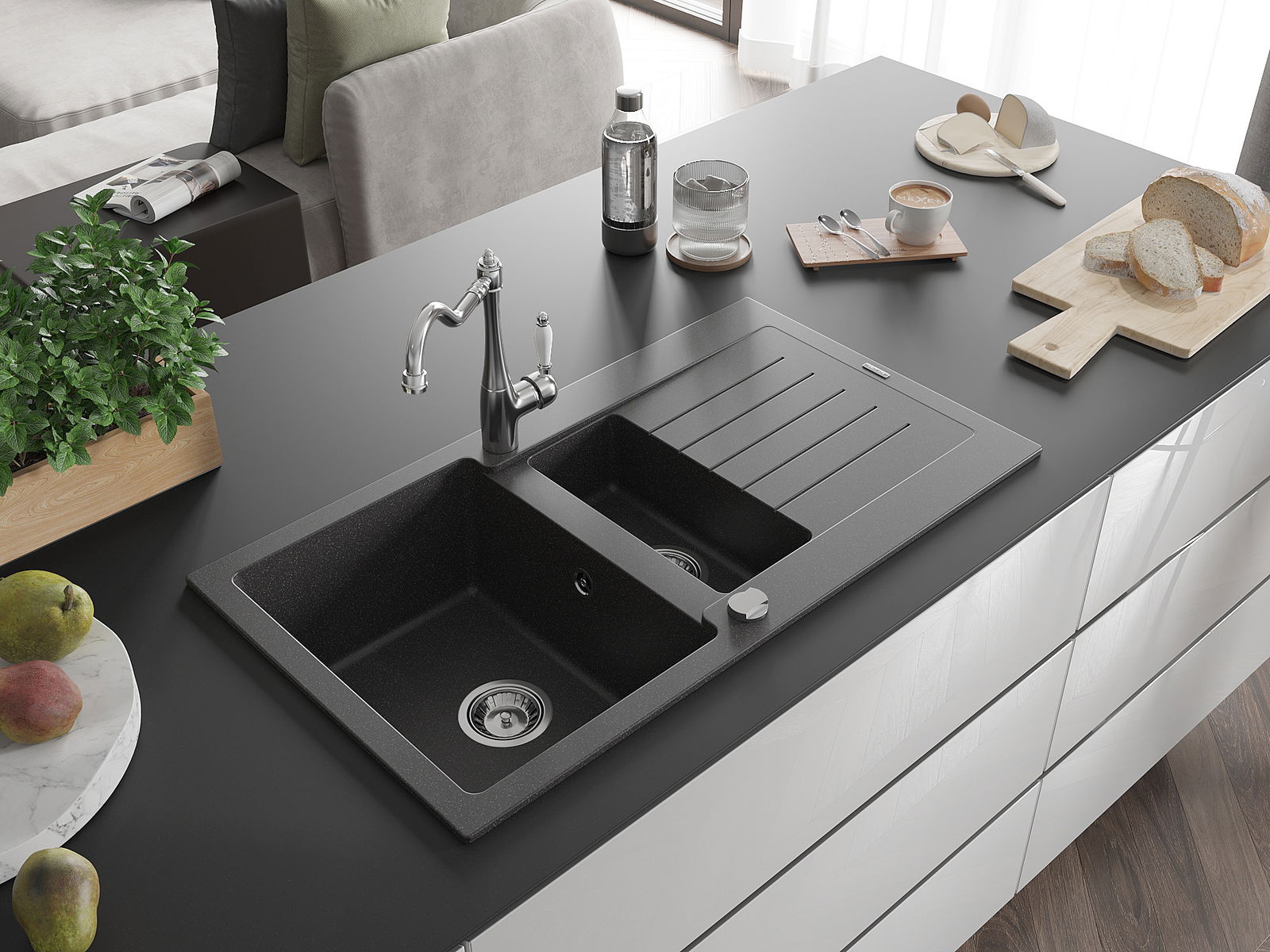 Suprafața chiuvetei este rezistentă la pete și decolorarea, datorită căreia este ușor de curățat și își păstrează culoarea mult timp. Estetică și practic completarea fiecărei bucătării.